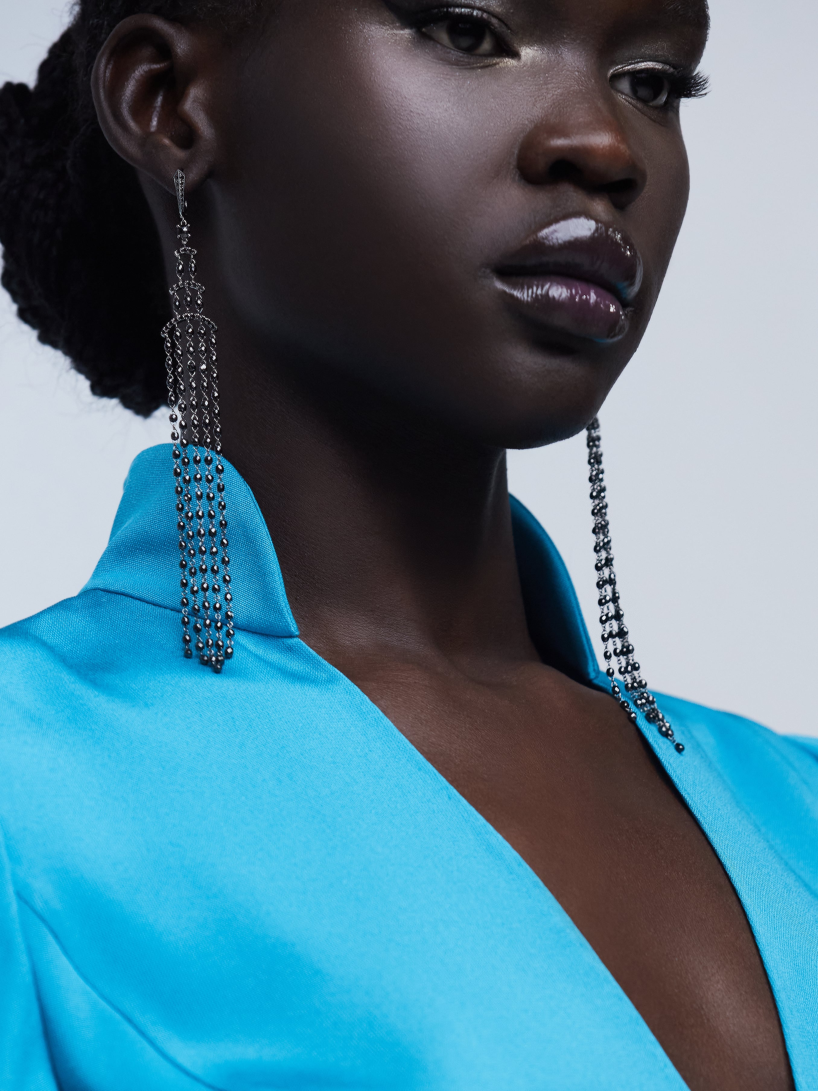 Long earrings in blackened gold, set with 198 black briolette-cut diamonds with a total weight of 30.91 ct, 104 round black diamonds with a total weight of 1.41 ct, and 2 rose-cut black diamonds with a total weight of 0.40 ct.