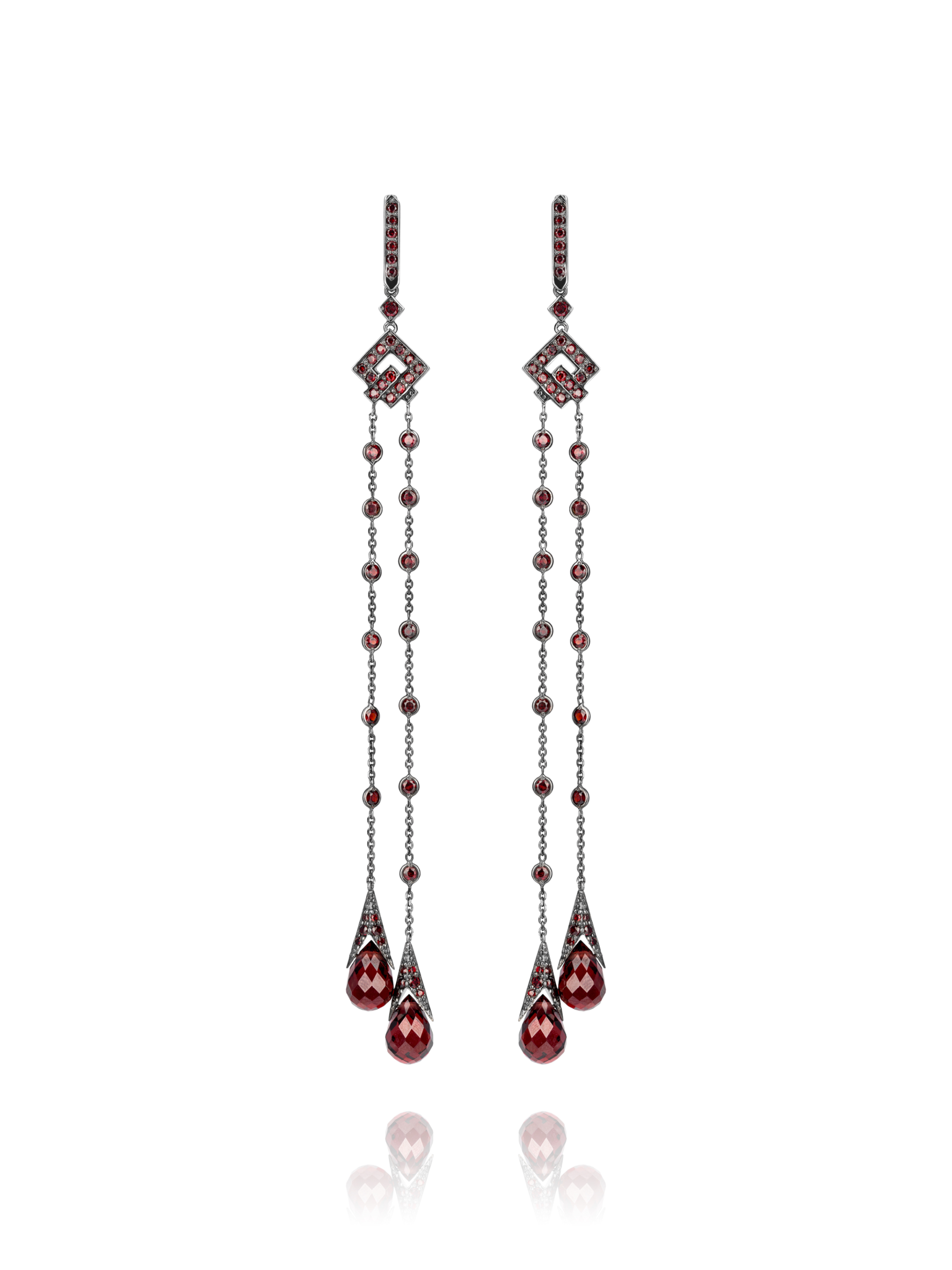 Earrings made of blackened gold, inlaid with 124 round garnets with a total weight of 3.03 ct and 4 briolette-cut garnets with a total weight of 17.50 ct. Item length 13 cm.