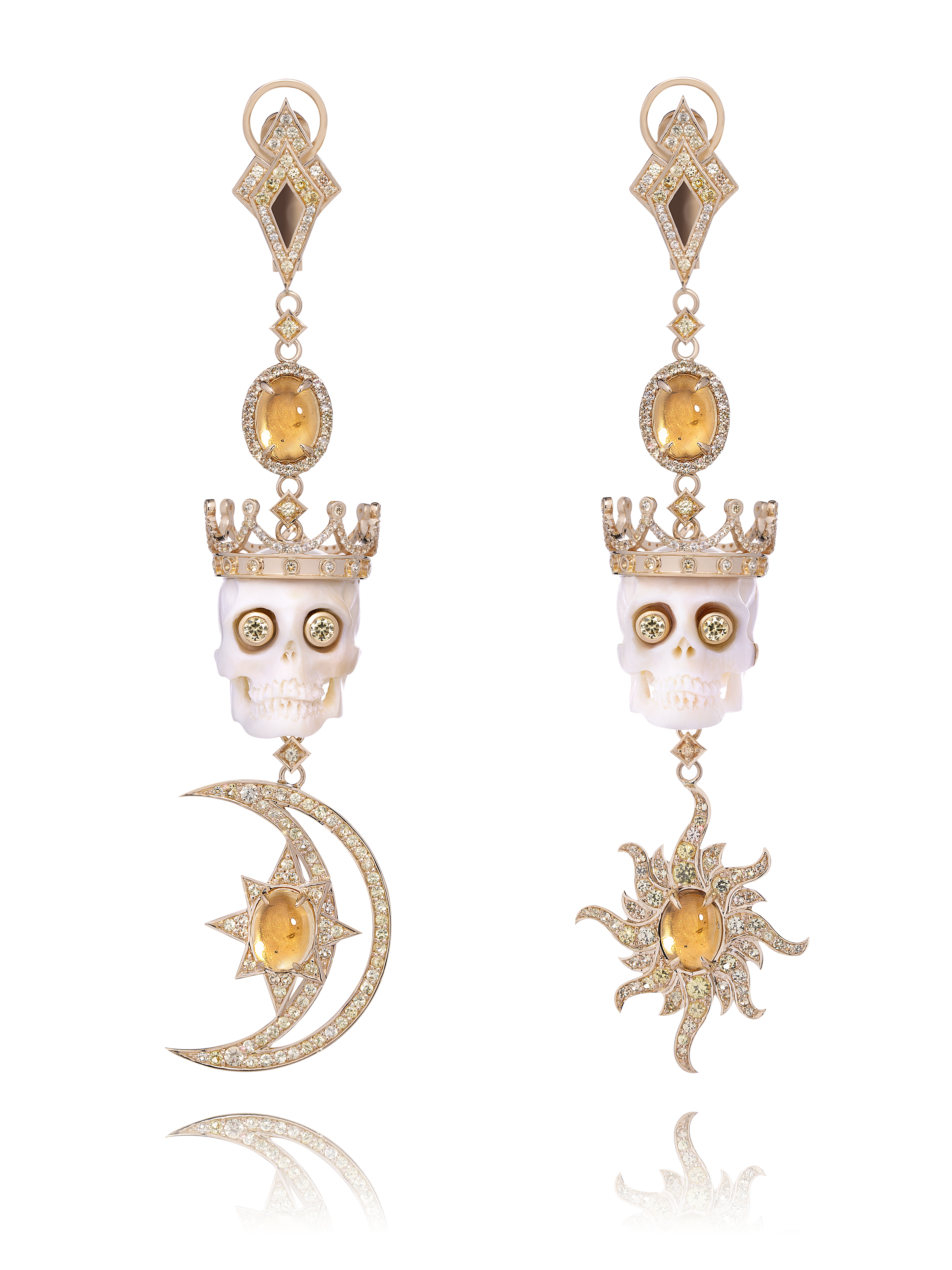 Earrings made of gold with 4 cabochon-cut citrines with a total weight of 3.50 ct, 425 yellow sapphires with a total weight of 4.00 ct, and 2 mammoth tusk skulls with a total weight of 11.48 g. Item length 9 cm.