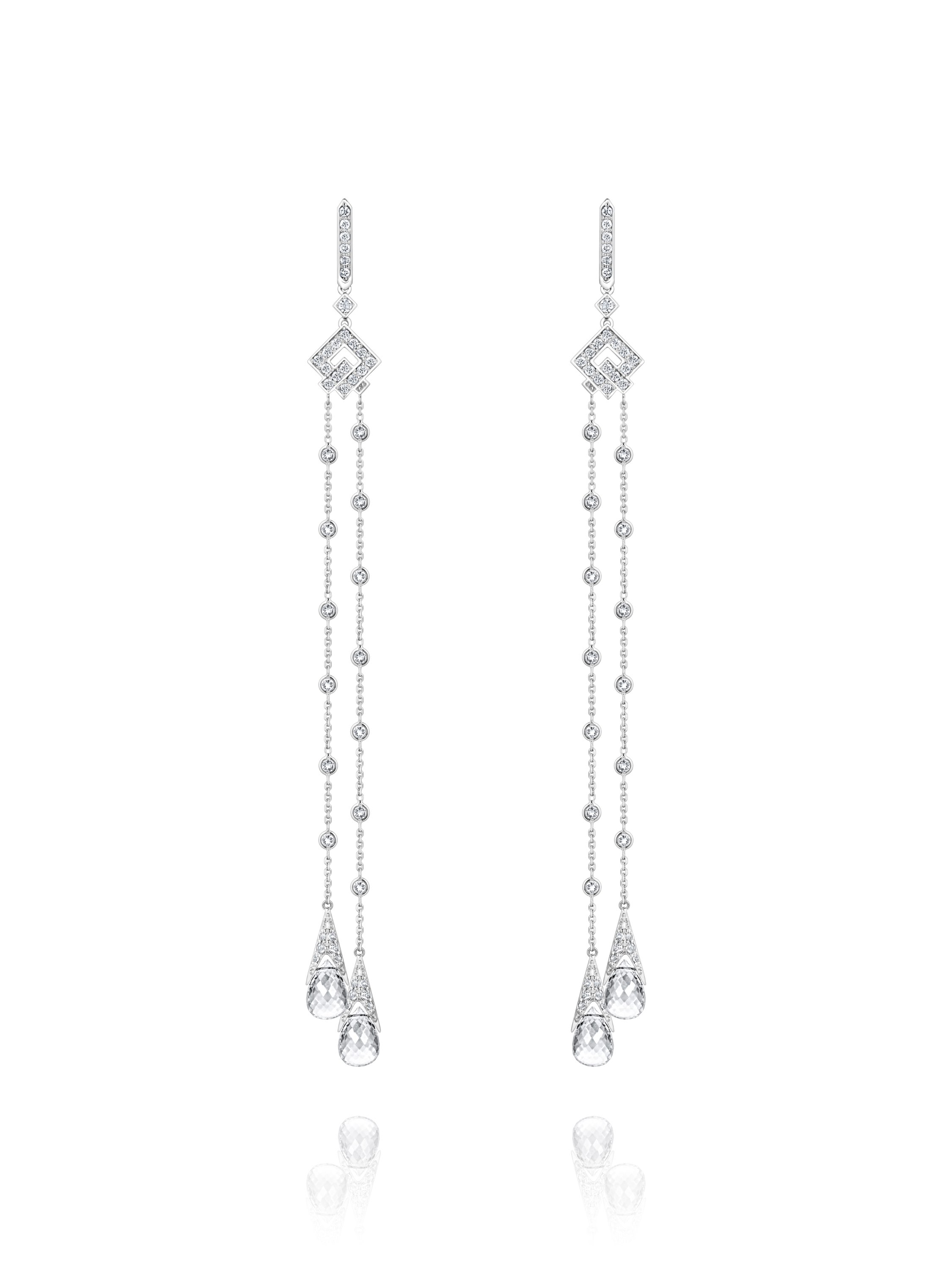 Long earrings with 4 rock crystal briolettes weighing 16.73 ct and 124 round colorless topazes weighing 3.00 ct. Length: 12 cm.