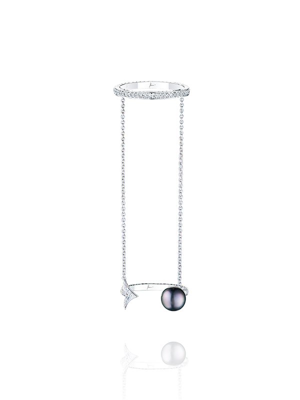 Double ring in white gold with 70 round-cut black diamonds weighing 0.19 ct, 97 round-cut grey diamonds with a total weight of 0.7 ct, and 0.1 g of pearl with a diameter of 4.0 mm.
