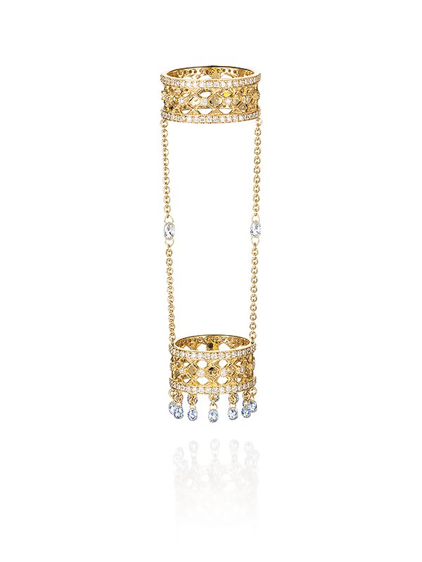 A double ring made of yellow gold with 197 round-cut diamonds with a total weight of 0.98 ct and 14 briolette-cut diamonds with a total weight of 1.47 ct.