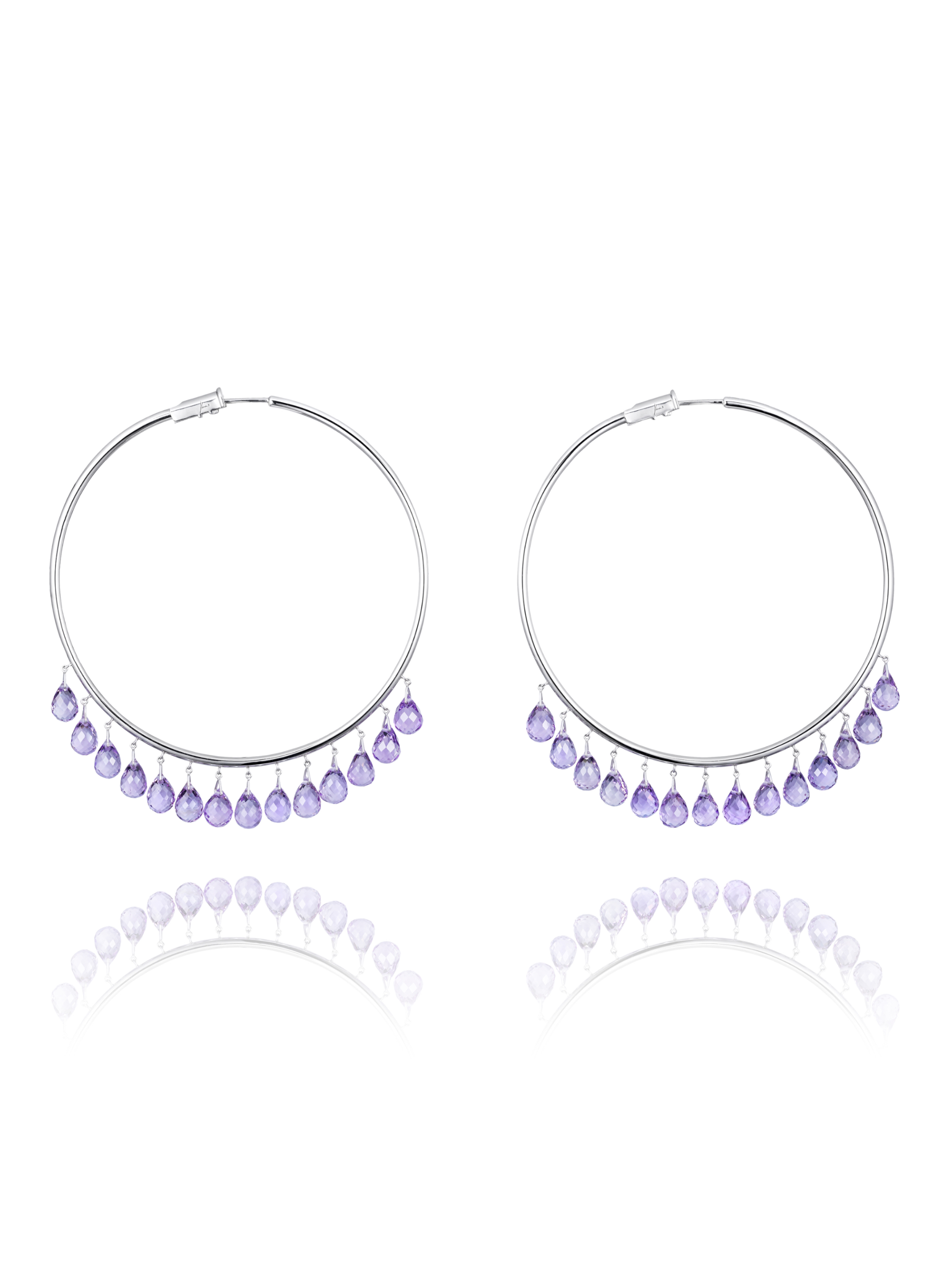 Hoops made of white gold, set with 28 briolette-cut amethysts with a total weight of 28.94 ct. Diameter: 6.5 cm.