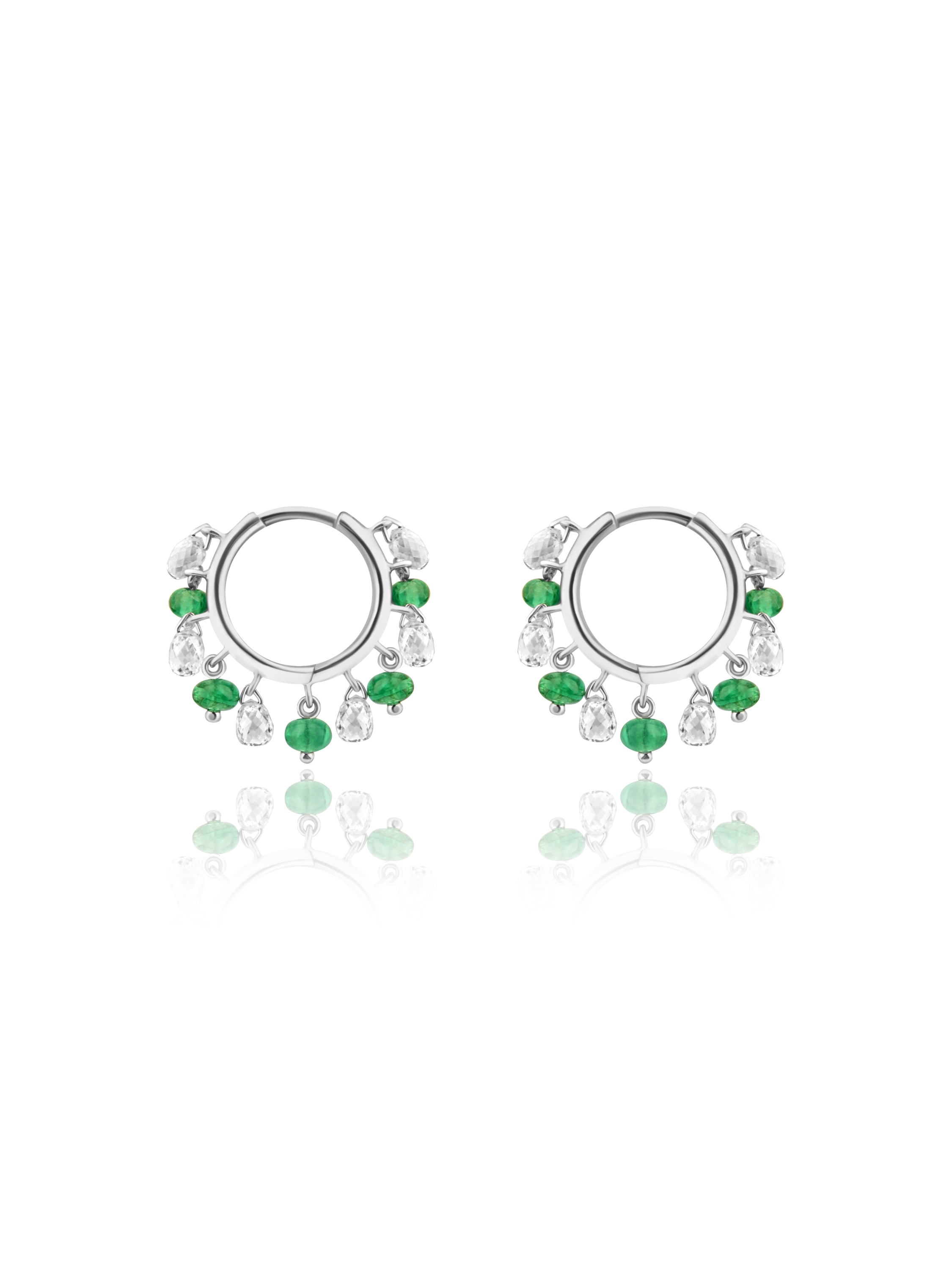 White gold hoops with emerald beads and diamonds