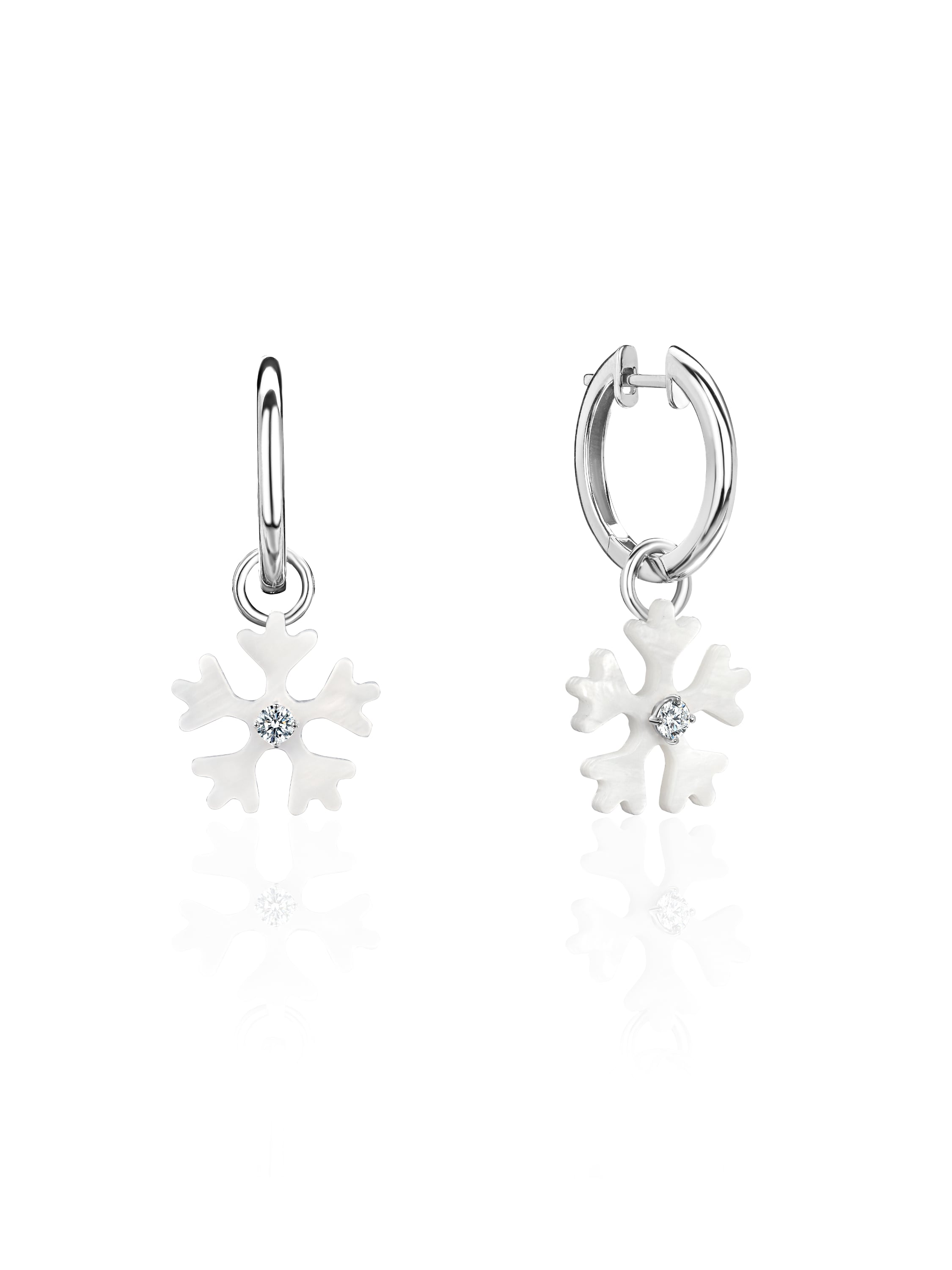 White gold hoops with zircon and carved mother-of-pearl snowflakes