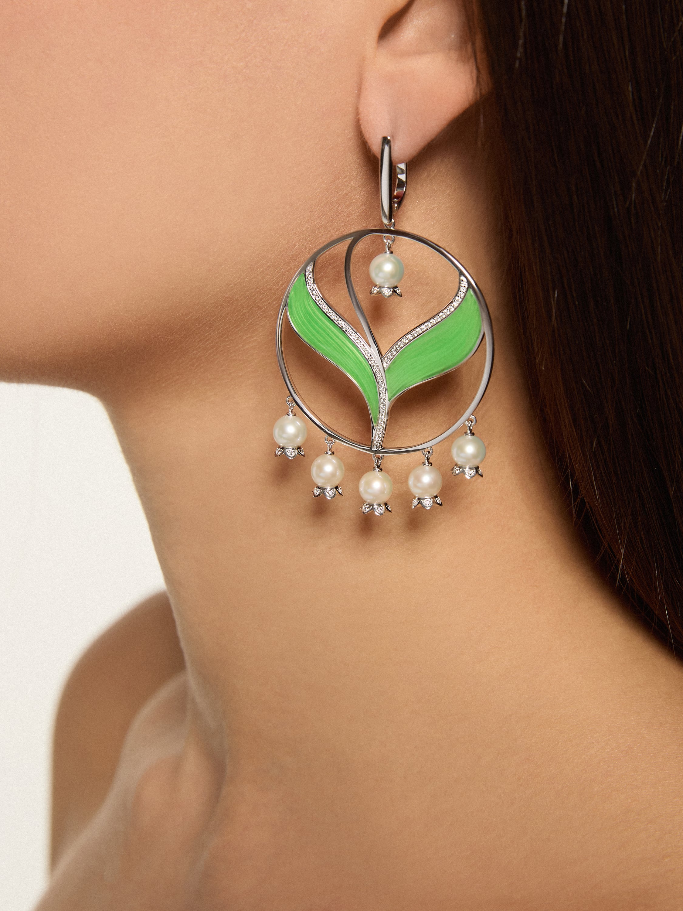 Lily-of-the-valley hoops made of white gold, inlaid with 12 pearls with a total weight of 3.66 g and a diameter of 6 mm, 188 round-cut diamonds with a total weight of 0.94 ct, and light green enamel. Diameter: 6.5 cm.