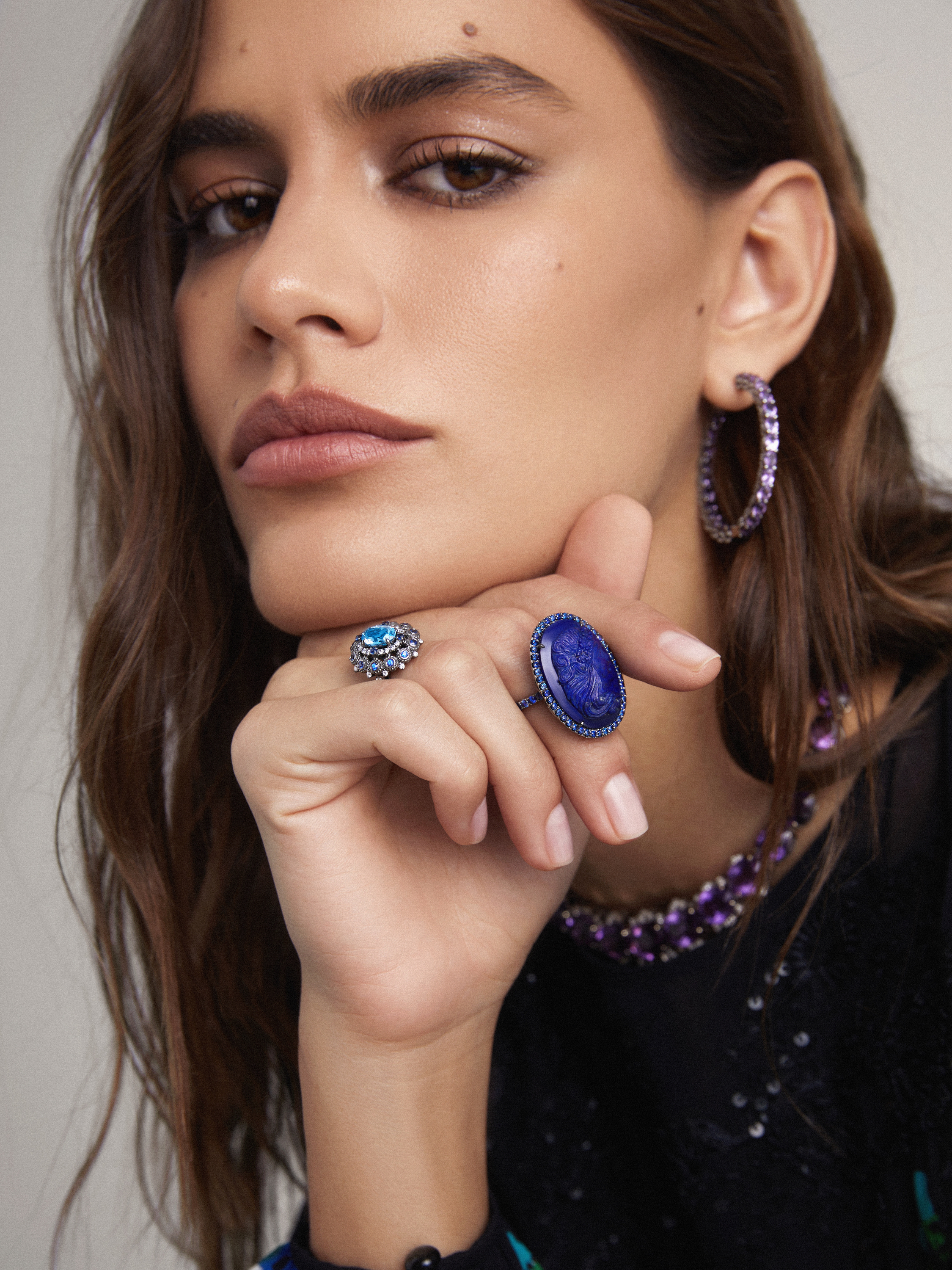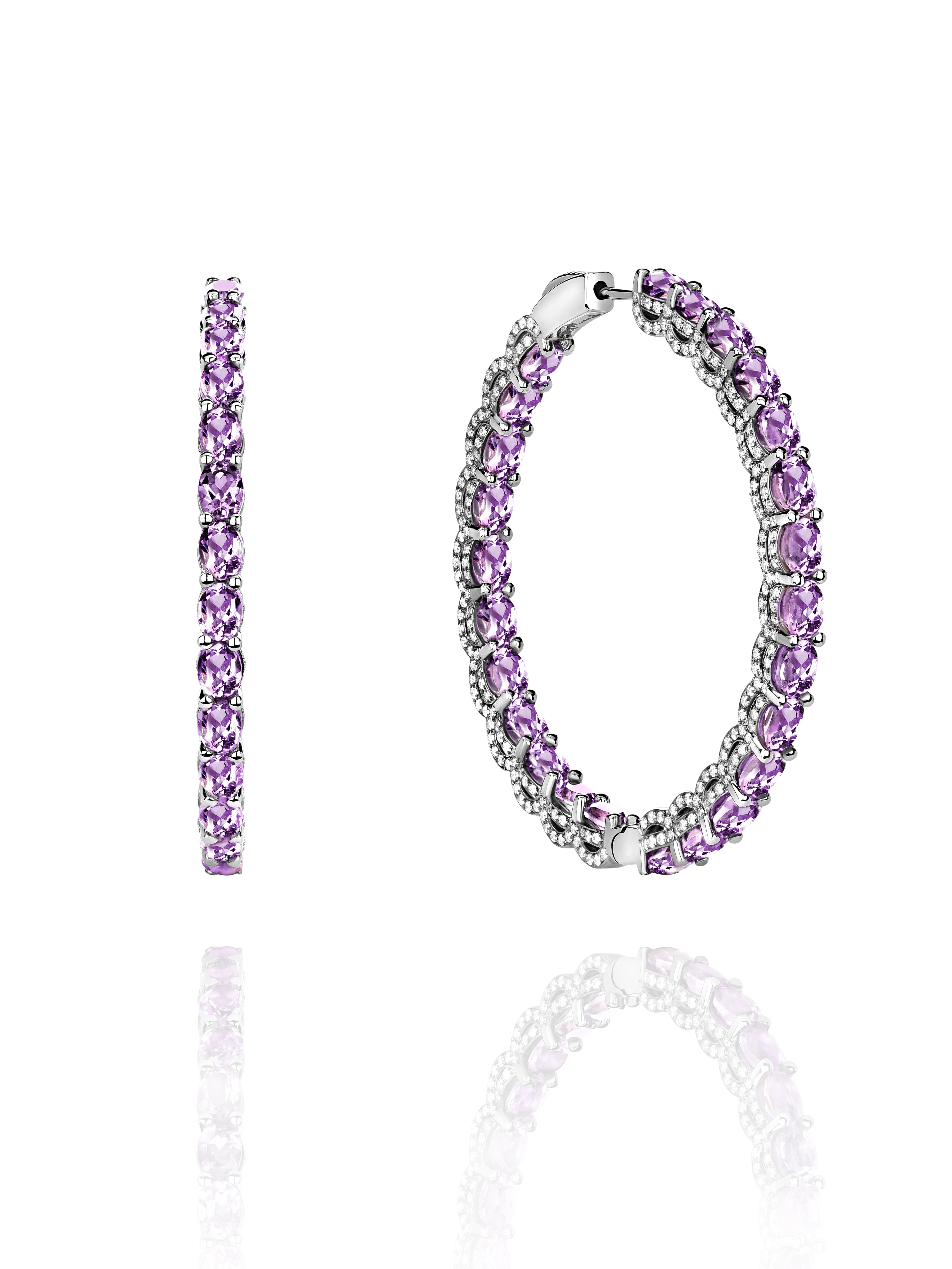 Hoops made of blackened gold with 50 oval amethysts with a total weight of 8.02 ct and 844 round-cut diamonds with a total weight of 2.34 ct. Diameter: 4 cm.