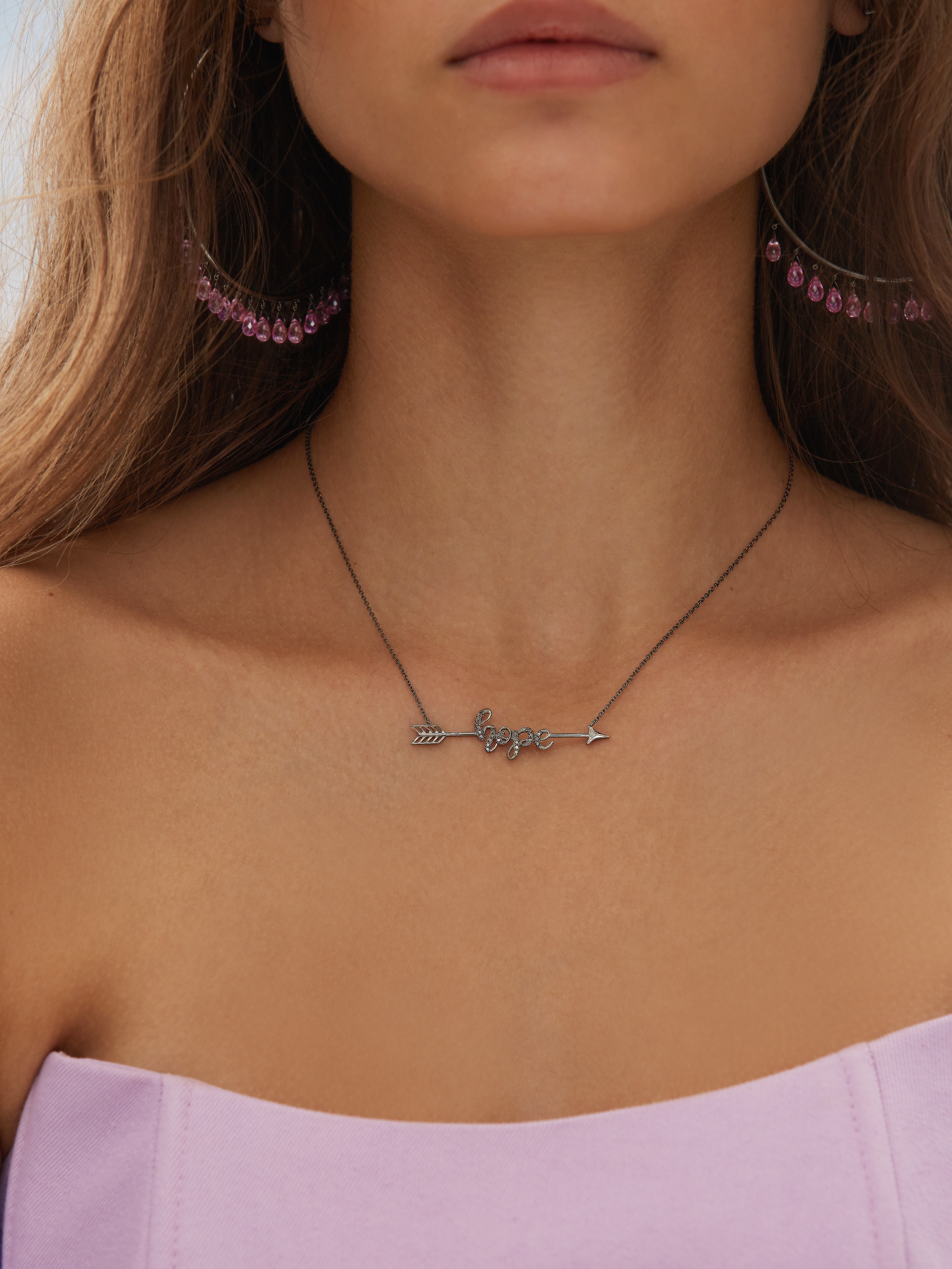 Hoops made of blackened gold with 38 briolette-cut pink sapphires with a total weight of 26.4 ct.