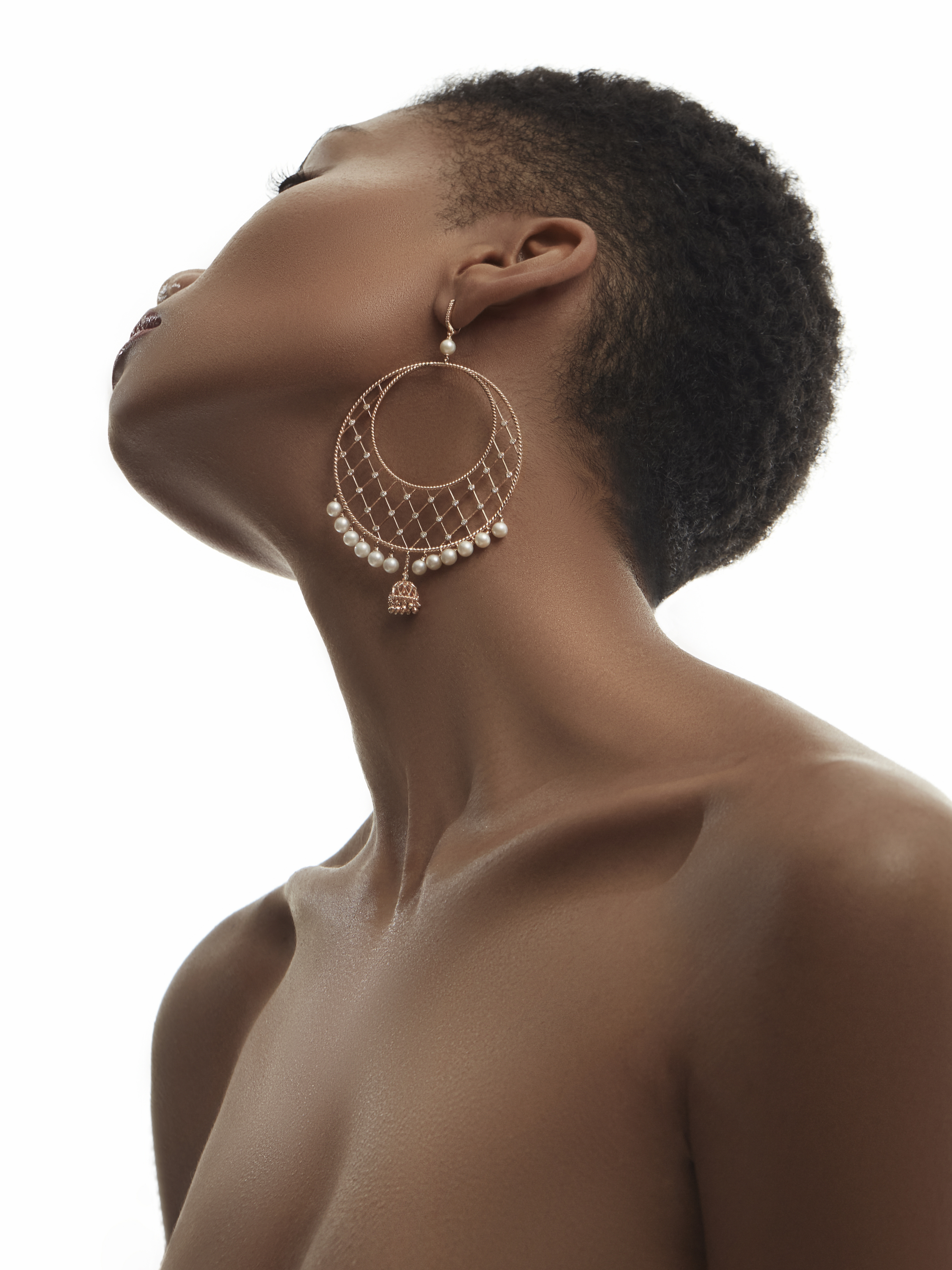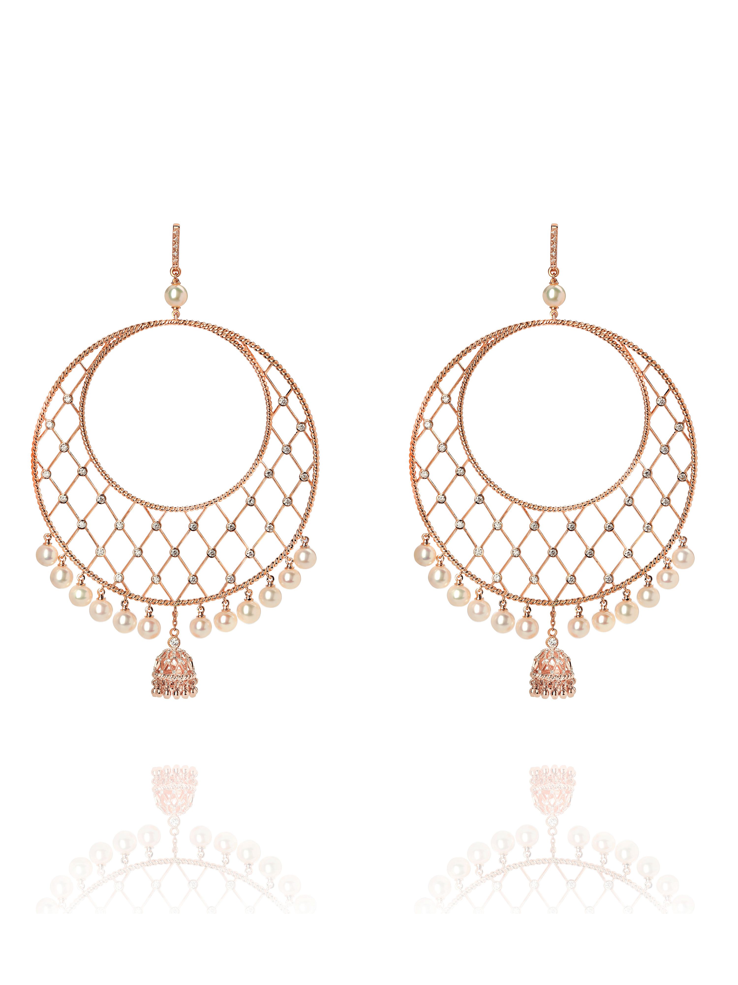 Hoops made of 585 rose gold with 132 round diamonds with a total weight of 1.57 ct and 26 pearls with a total weight of 5.19 g. Item length: 6.5 cm.