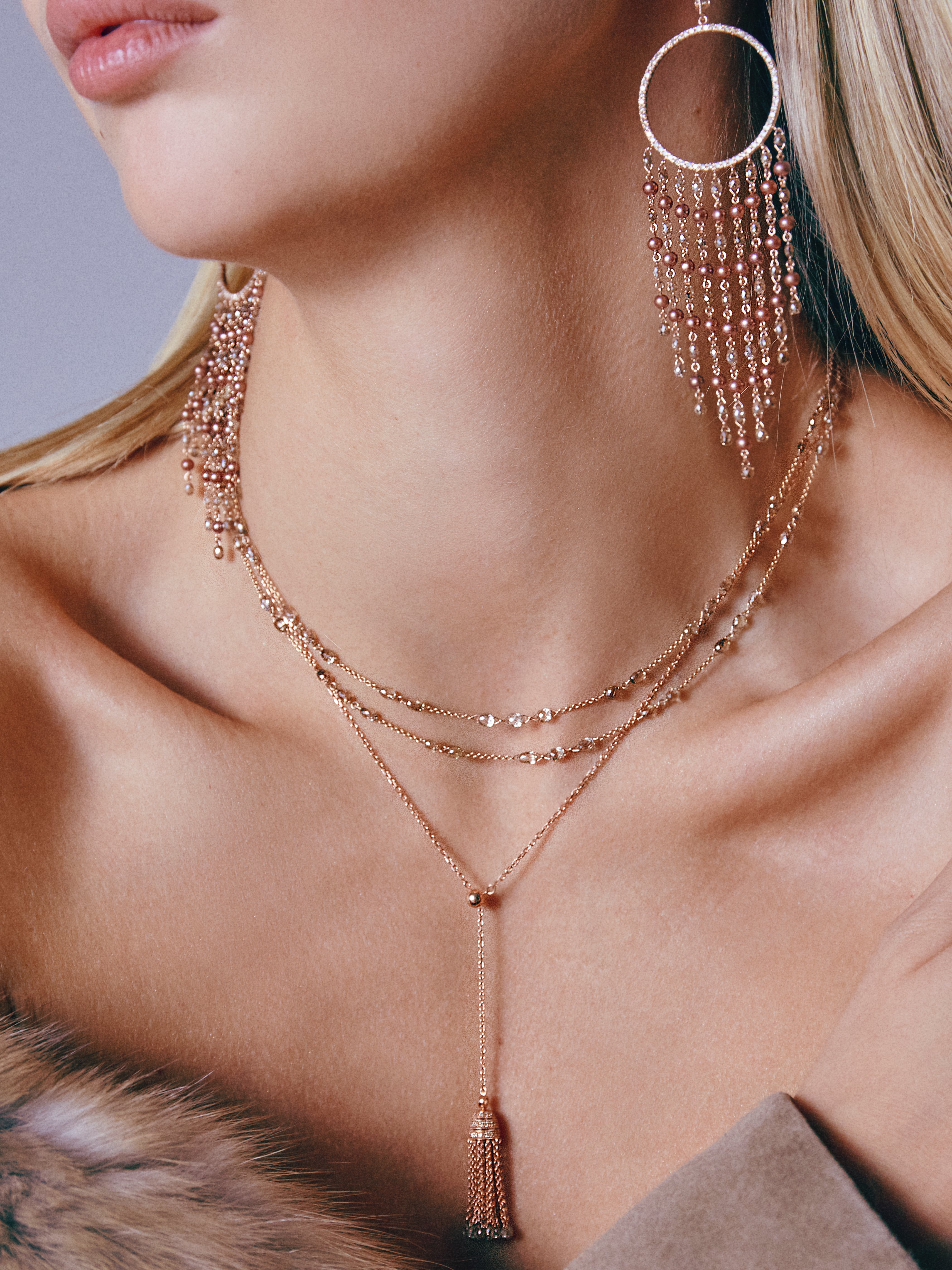 Hoop earrings in rose gold, set with 152 brown round diamonds with a total weight of 1.22 ct, 92 briolette-cut brown diamonds with a total weight of 9.30 ct and 66 brown pearls with a total weight of 2.18 g. Length of the piece: 10 cm.