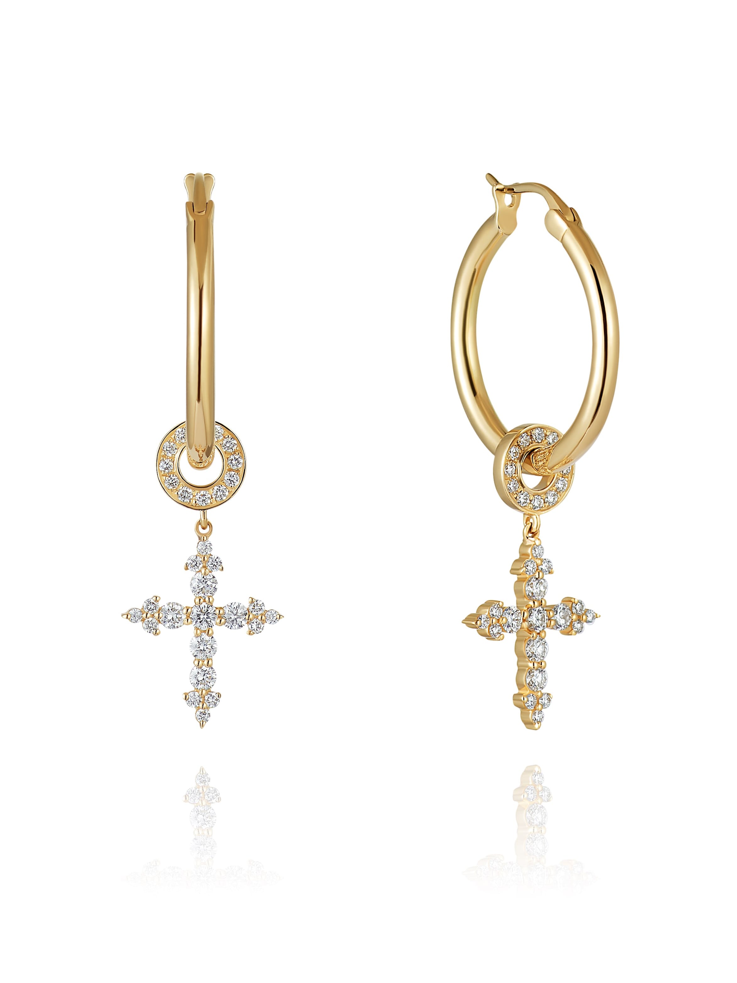Hoop earrings in yellow gold with cross pendants with 48 round brilliant-cut diamonds with a total weight of 0.31 ct and 12 yellow round brilliant-cut diamonds with a total weight of 0.49 ct.