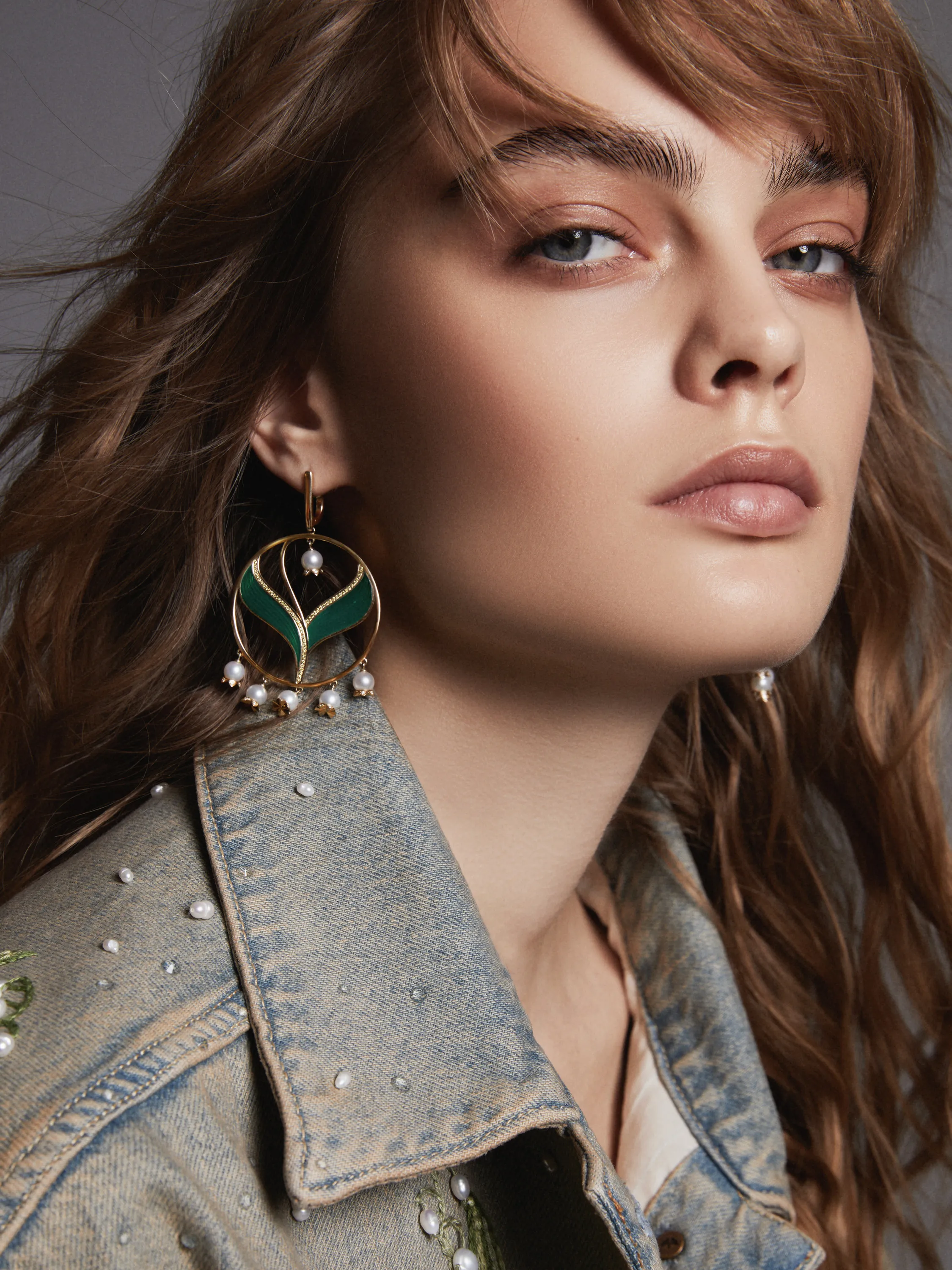 Lily hoop earrings in yellow gold, inlaid with 12 pearls with a total weight of 2.89 g, 116 yellow round-cut diamonds with a total weight of 0.31 ct, 72 round-cut diamonds with a total weight of 0.22 ct, and green enamel. Diameter: 6.5 cm.
