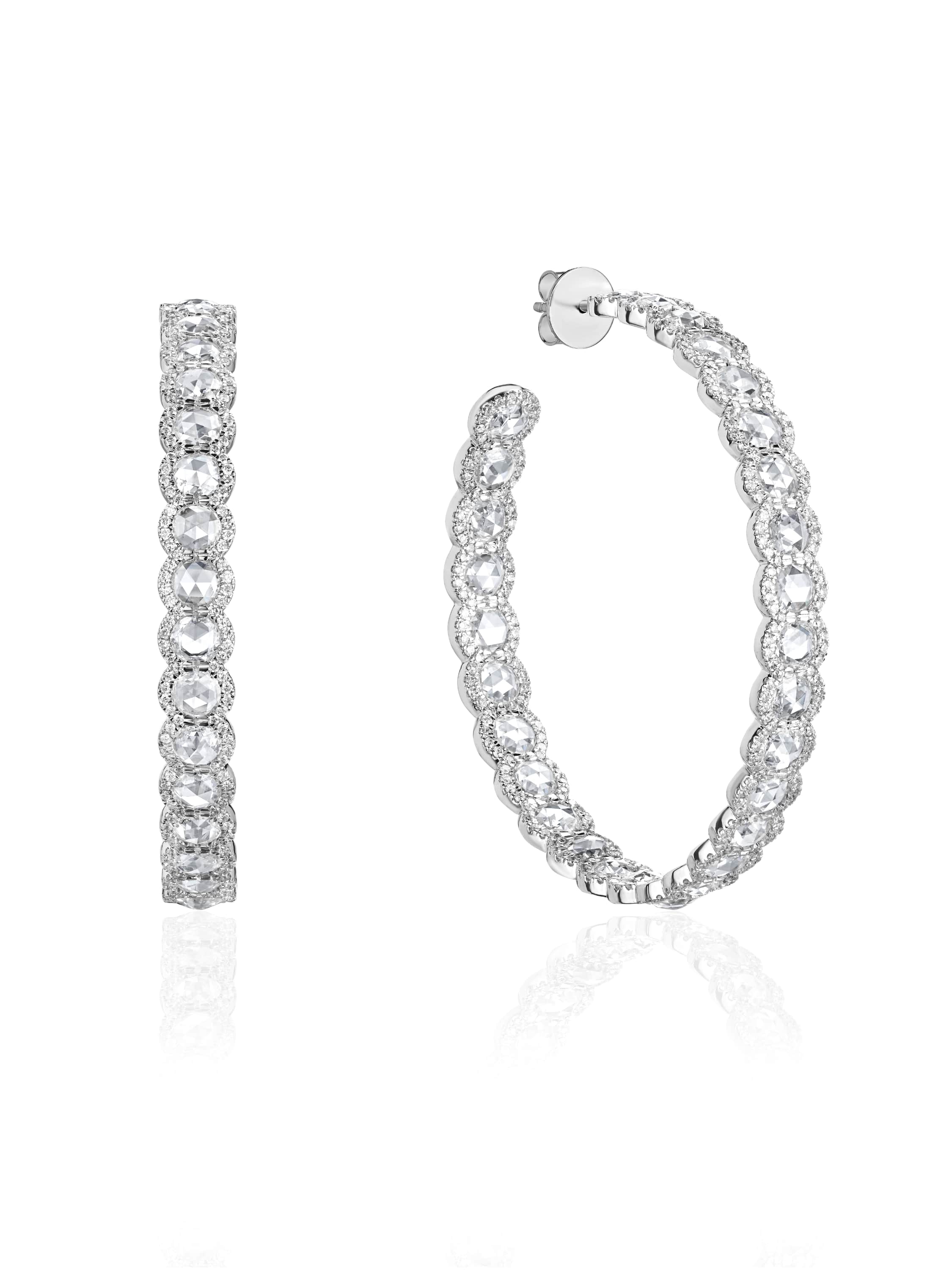 Hoops with 58 Rose Cut diamonds weighing 5.80 ct and 592 round diamonds weighing 1.40 ct. Diameter: 4 cm.