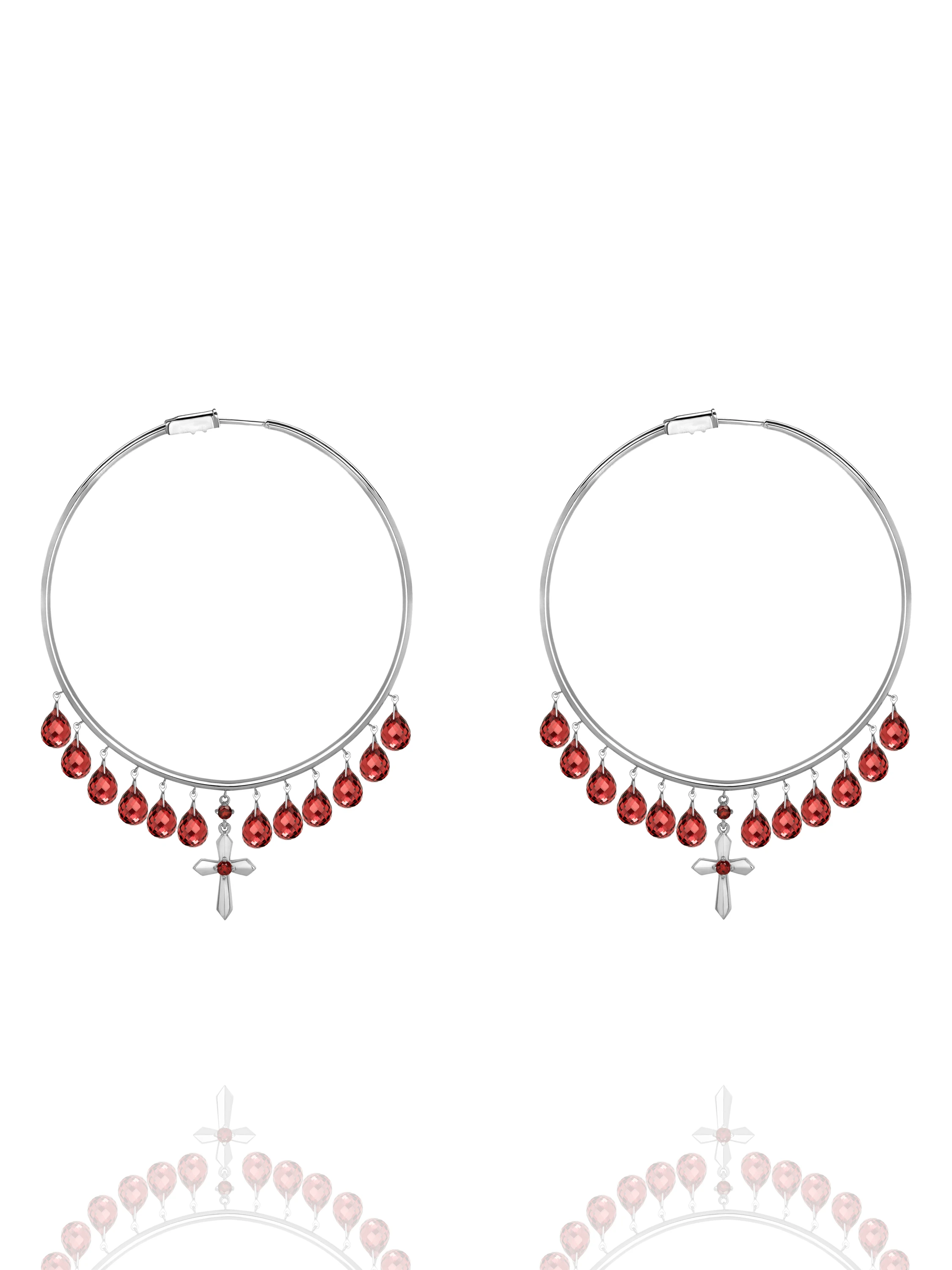 Hoop earrings with crosses in white gold with 24 briolette-cut garnets with a total weight of 39.29 ct and 4 round-cut garnets with a total weight of 0.27 ct. Diameter: 6.5 cm.