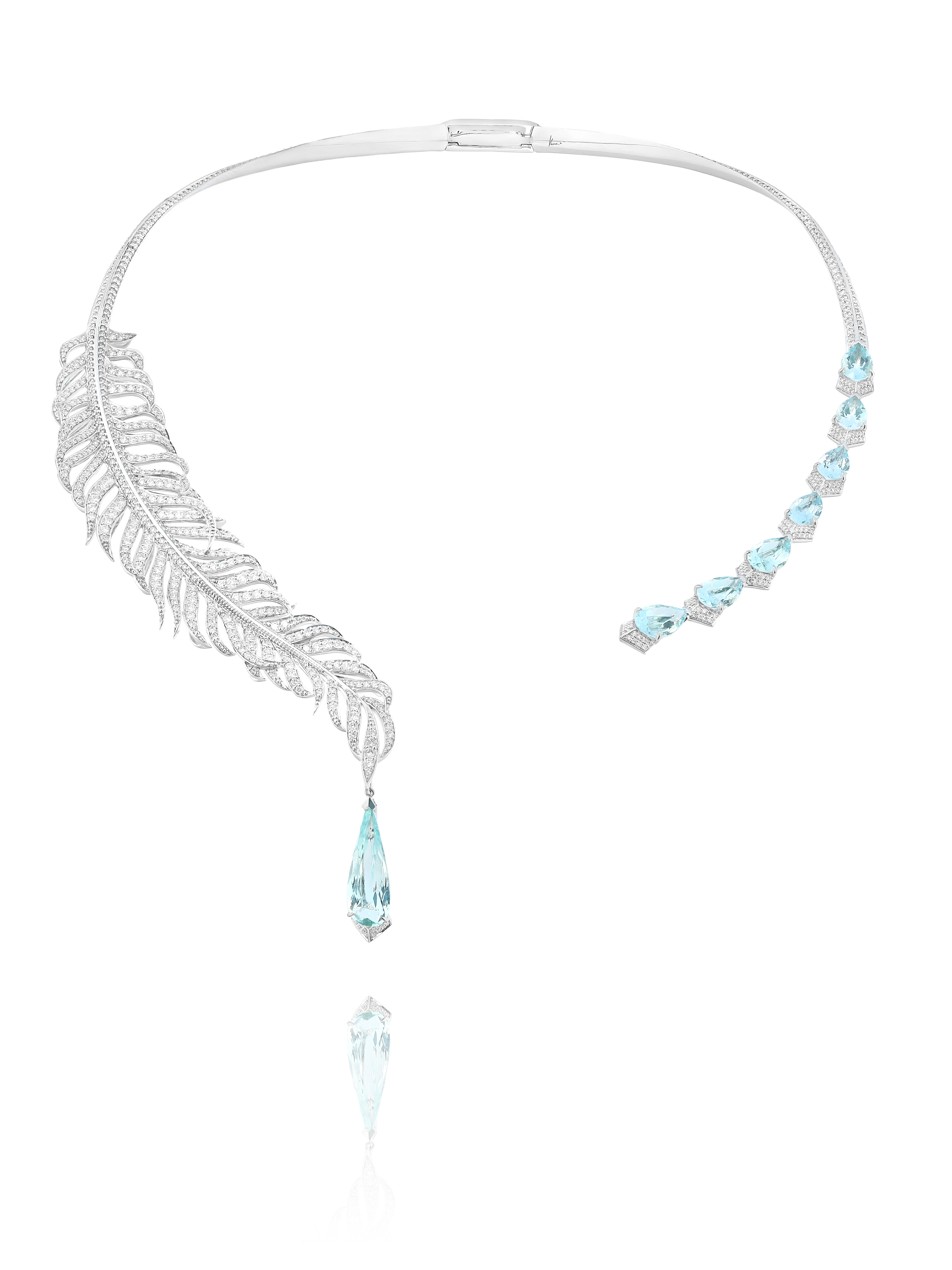 A 750 white gold necklace set with 818 round diamonds with a total weight of 5.4 ct, 1 aquamarine weighing 2.80 ct, and 7 aquamarines with a total weight of 5.37 ct.