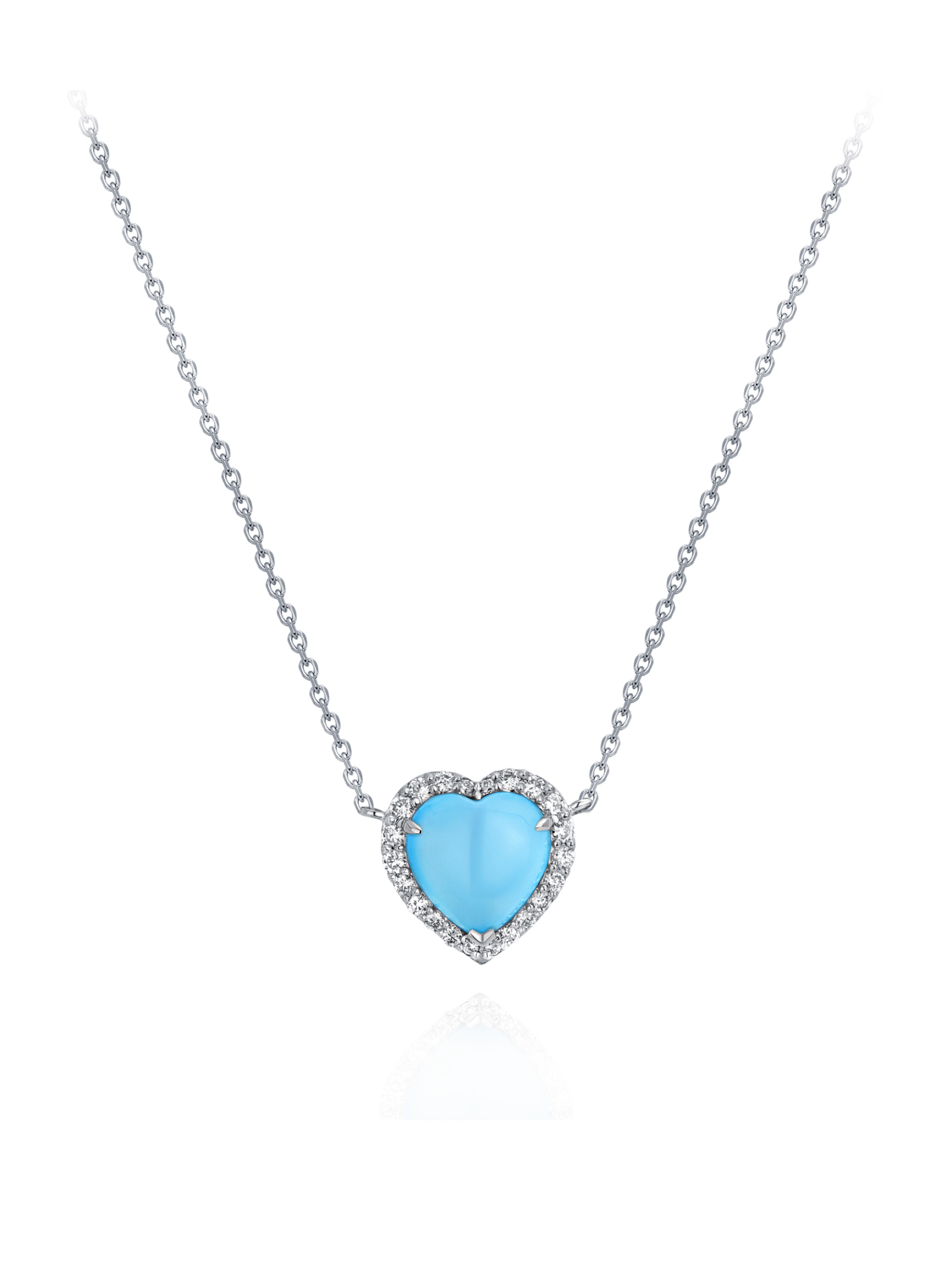 Necklace in 750 white gold with 84 round-cut diamonds with a total weight of 0.53 ct, 1 briolette-cut diamond weighing 0.09 ct, and a heart-shaped turquoise cabochon weighing 1.27 g.