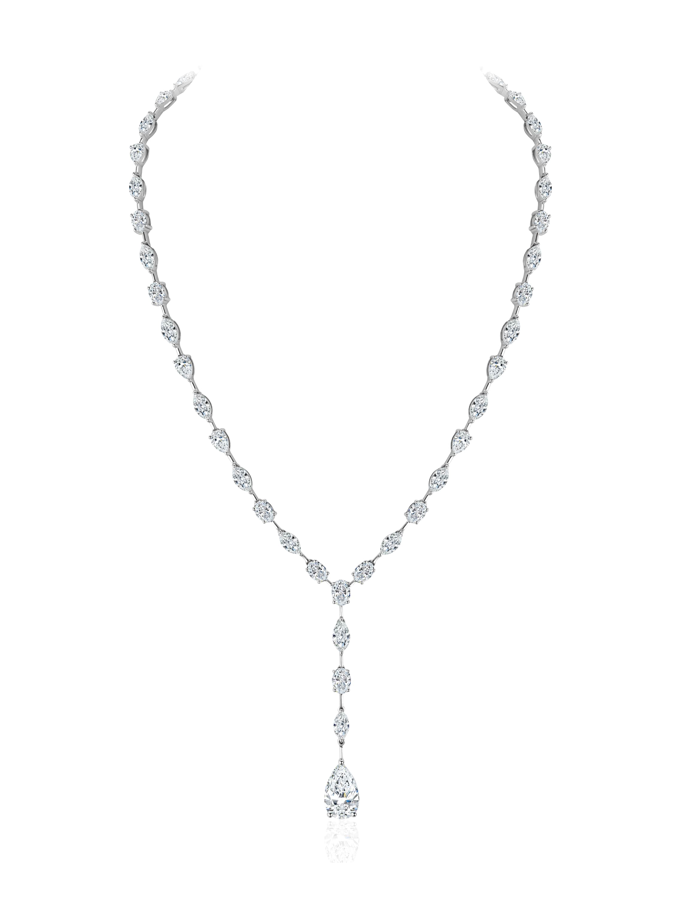 White gold necklace with 1 pear-cut LG diamond of 5.01 ct E/VS2, 10 pear-cut LG diamonds of 5.80 ct E/VS1, 14 oval LG diamonds of 6.37 ct E/VS1, and 22 marquise-cut LG diamonds weighing 7.00 ct.
