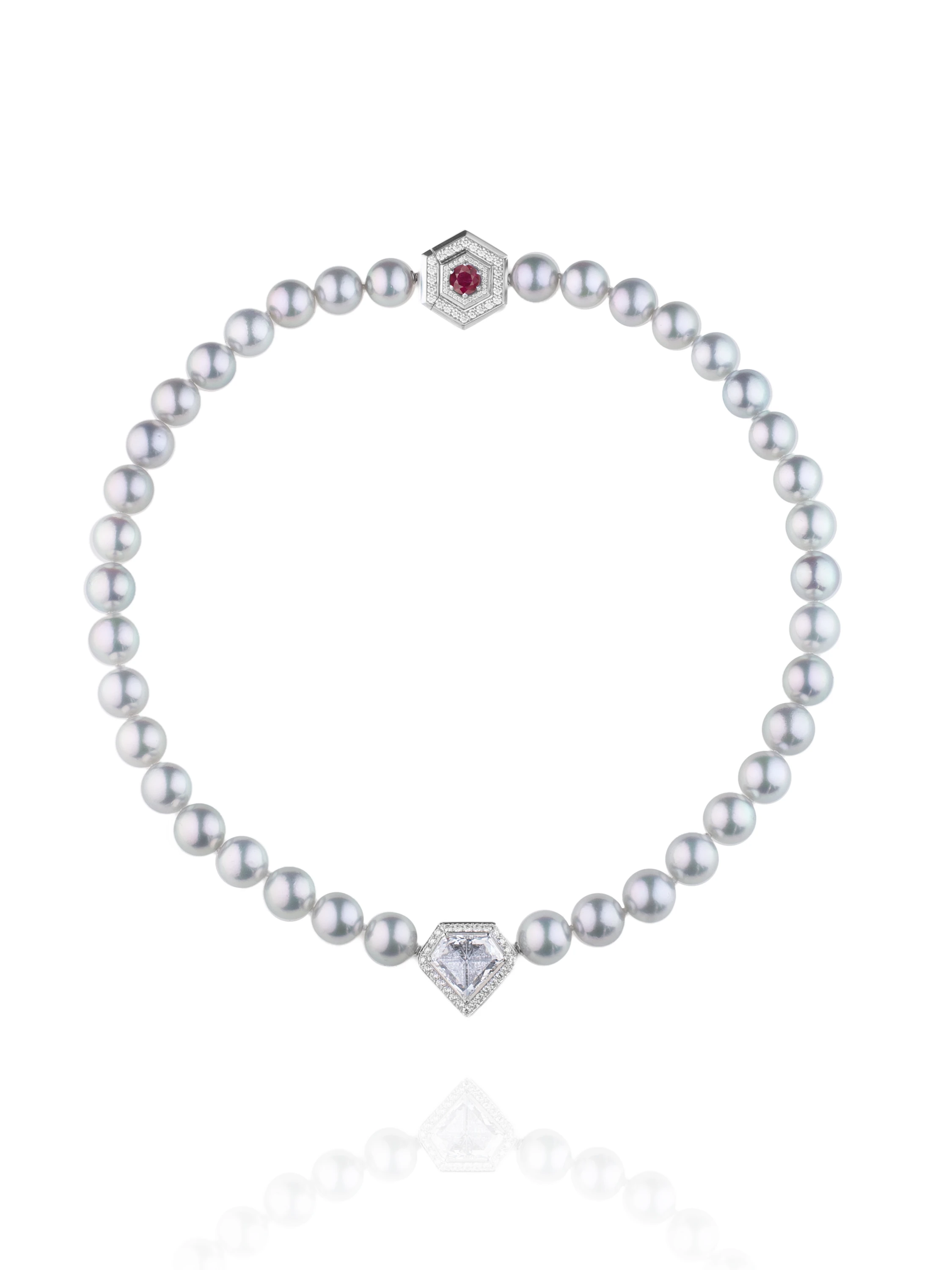Necklace in white gold, set with a Fantasy-cut diamond weighing 2.74 ct D/VS2, 172 round brilliant-cut diamonds with a total weight of 1.53 ct, a ruby weighing 0.88 ct, and 38 grey pearls with a total weight of 42.53 g.