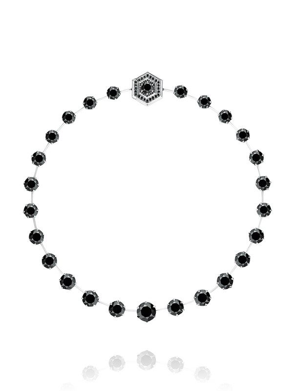 A white gold necklace with 74 black round diamonds with a total weight of 60.31 ct.