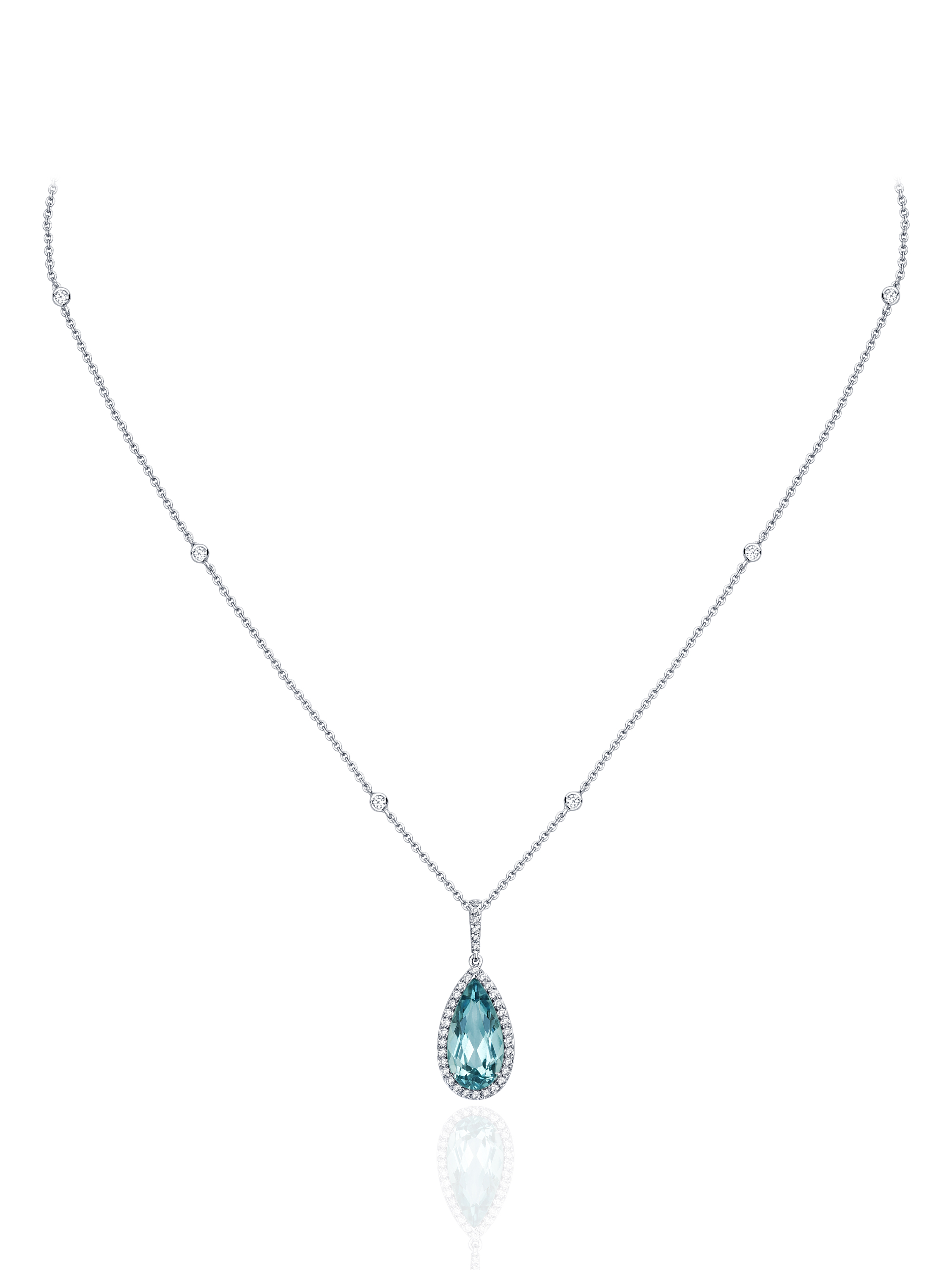 Necklace in white gold and diamonds with a pear-cut aquamarine pendant weighing 3.60 ct, 66 round diamonds with a total weight of 0.39 ct, and 1 briolette-cut diamond weighing 0.07 ct.