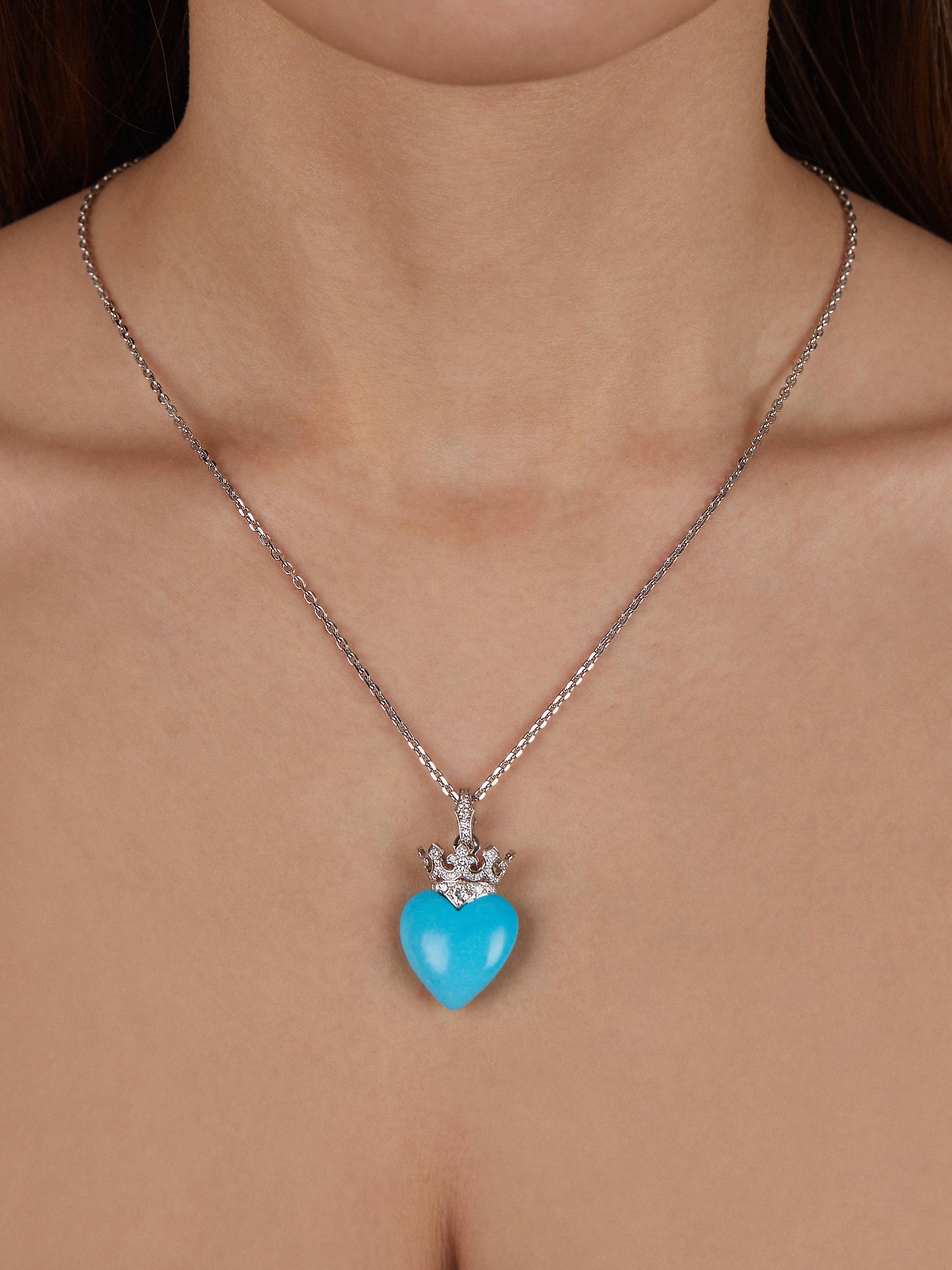 Necklace made of 750 white gold with a heart-shaped turquoise pendant weighing 4.58 ct and 83 round-cut diamonds with a total weight of 0.74 ct.