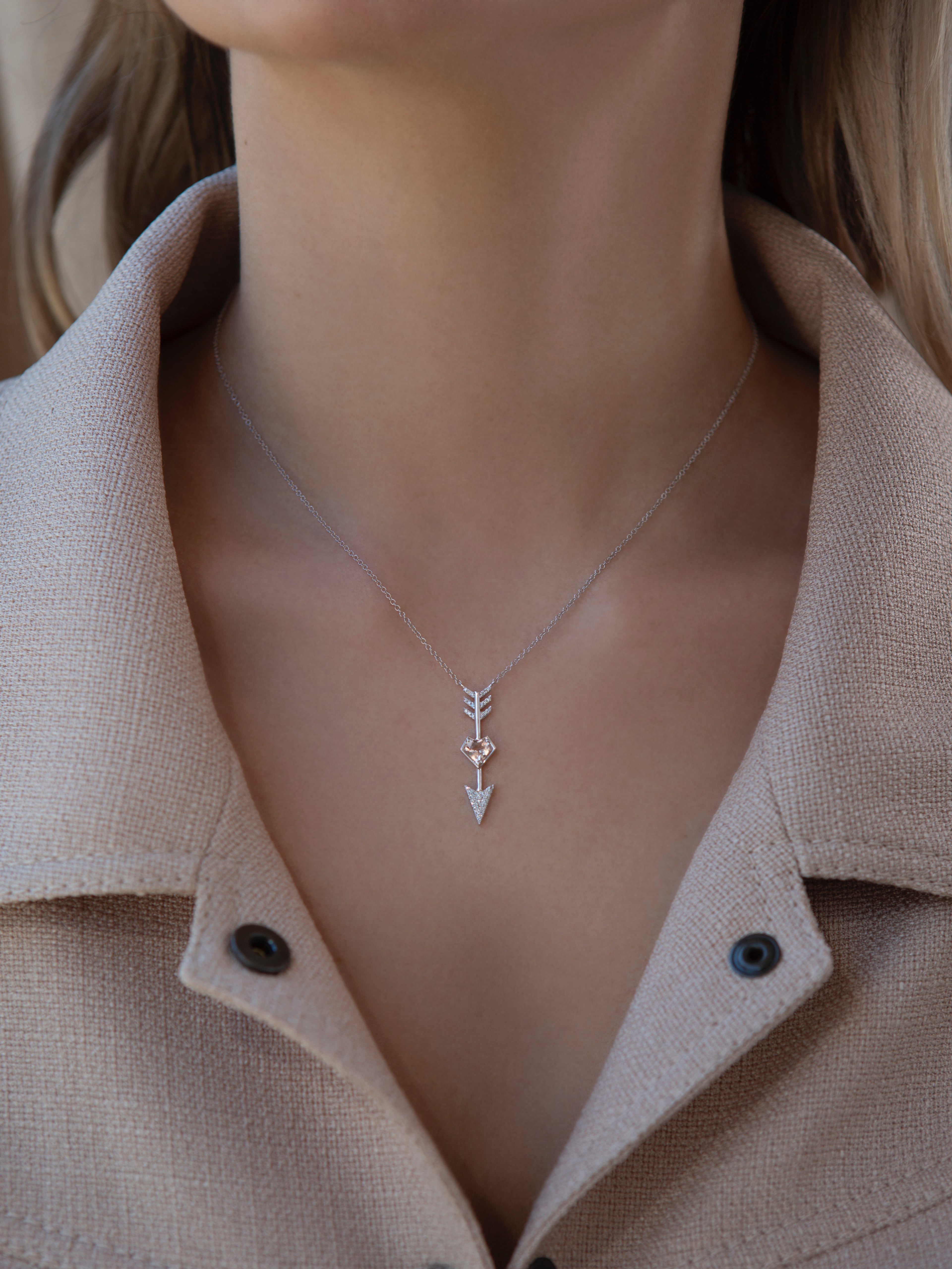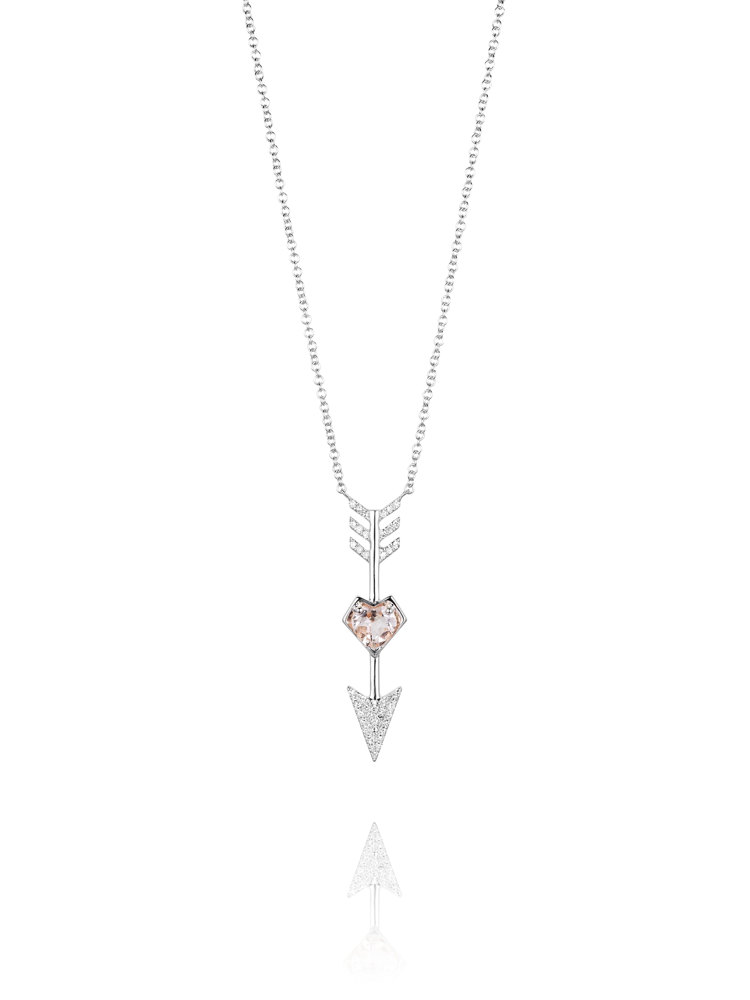 Necklace in white gold with a pendant featuring a heart-cut morganite weighing 0.39 ct and 44 round diamonds with a total weight of 0.10 ct.