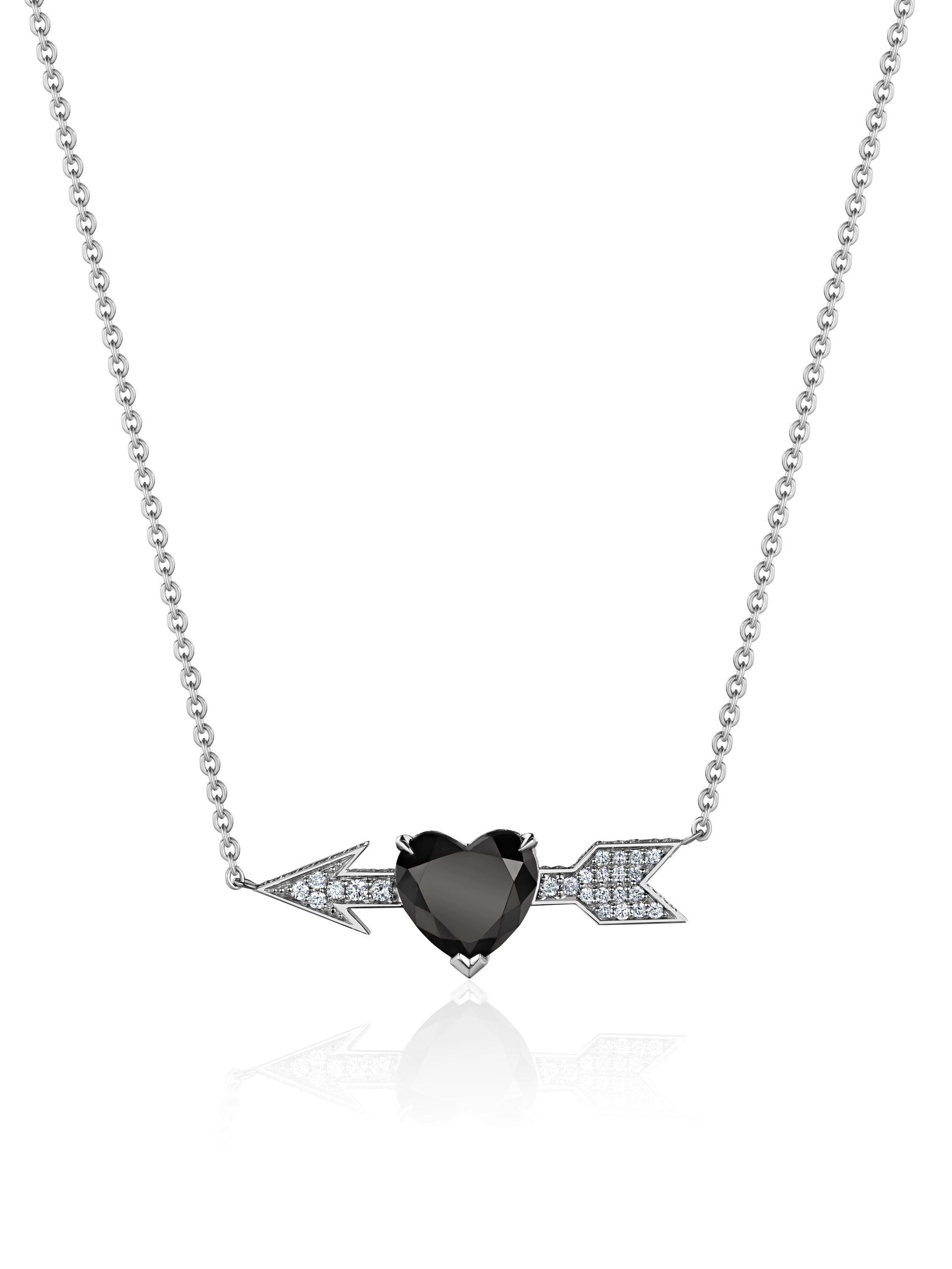 A white gold necklace with a pendant featuring a heart-cut black diamond weighing 3.23 ct, 80 round-cut diamonds with a total weight of 0.41 ct, and 1 briolette-cut diamond weighing 0.07 ct.