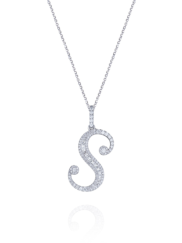 White gold necklace with a pendant in the shape of the letter S, set with 112 H/SI round-cut diamonds with a total weight of 0.56 ct.