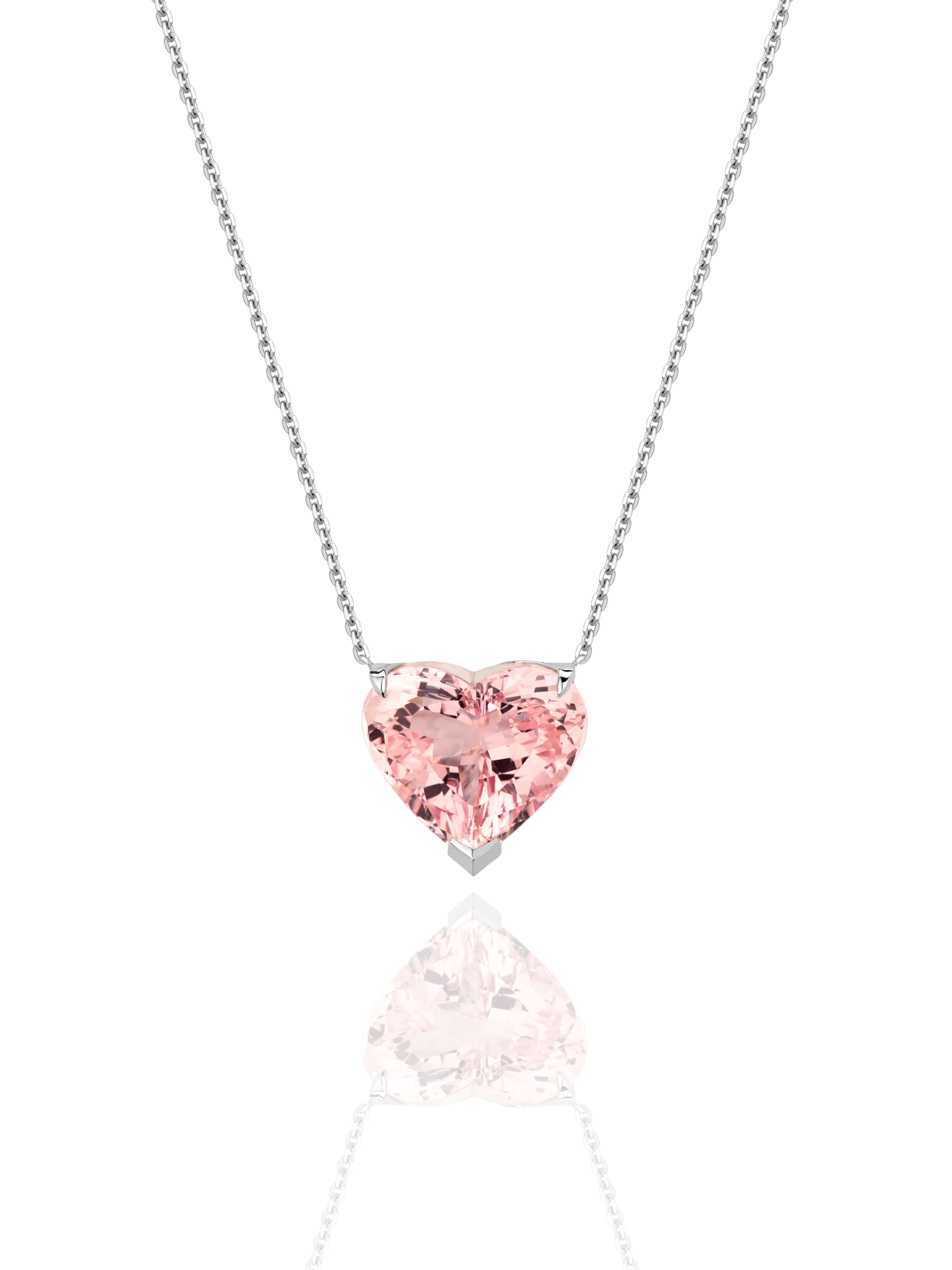 Necklace in white gold set with a heart-cut morganite weighing 6.46 ct, a briolette-cut diamond weighing 0.09 ct, and 148 round-cut diamonds with a total weight of 0.48 ct.