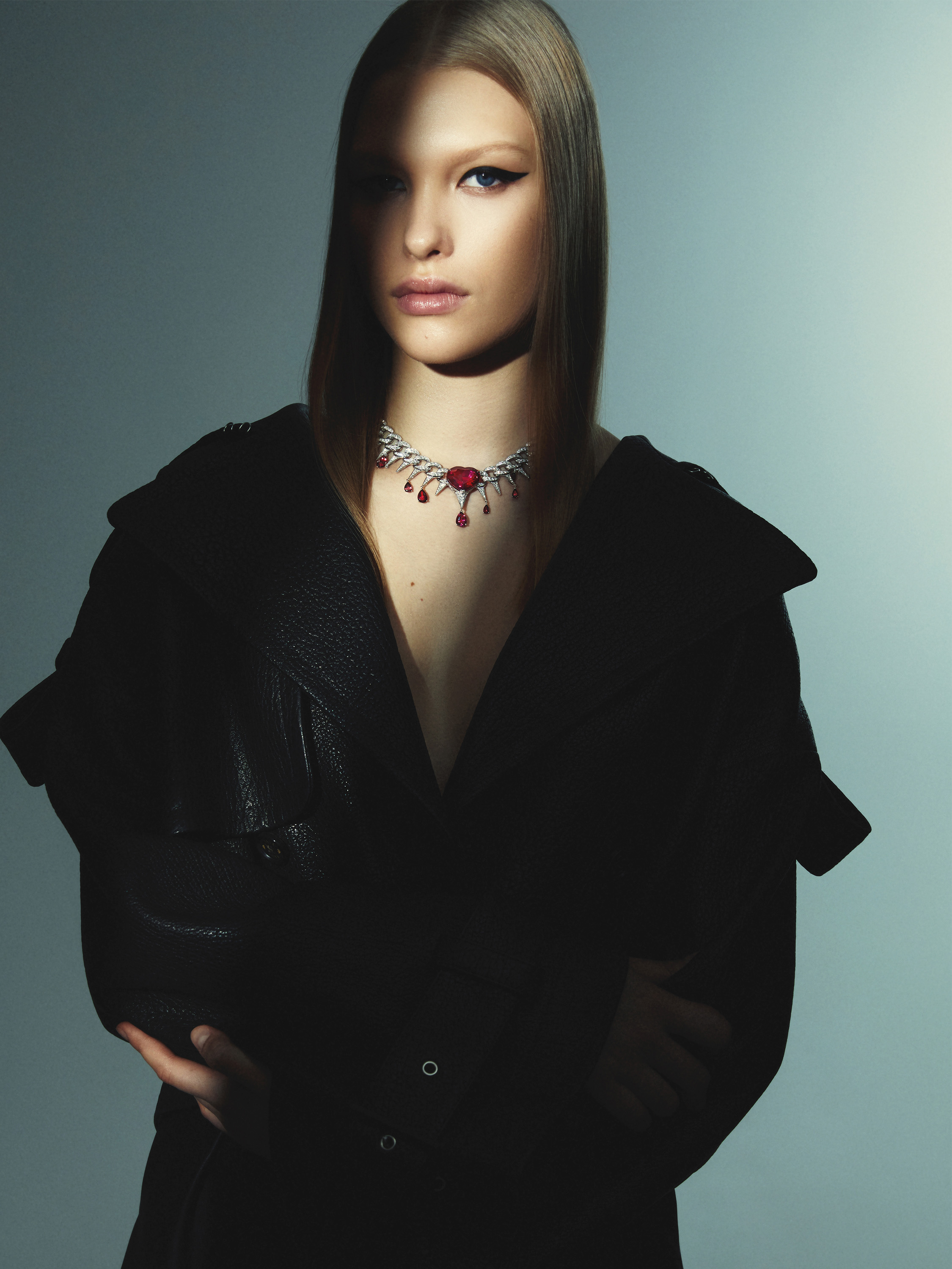 White gold necklace with a heart-cut rubellite weighing 27.8 ct, 927 round-cut diamonds with a total weight of 15.8 ct, 10 pear-cut rubellites with a total weight of 7.28 ct, and 1 round-cut ruby weighing 0.05 ct.