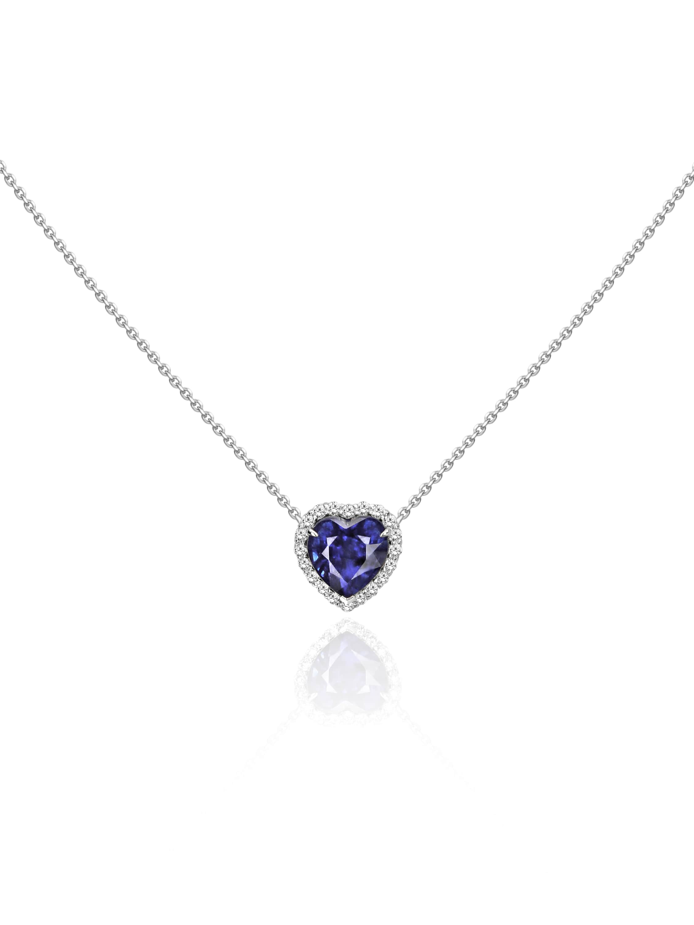 White gold necklace with a heart-cut sapphire weighing 2.42 ct, 78 round diamonds of 0.29 ct and 1 diamond weighing 0.09 ct.