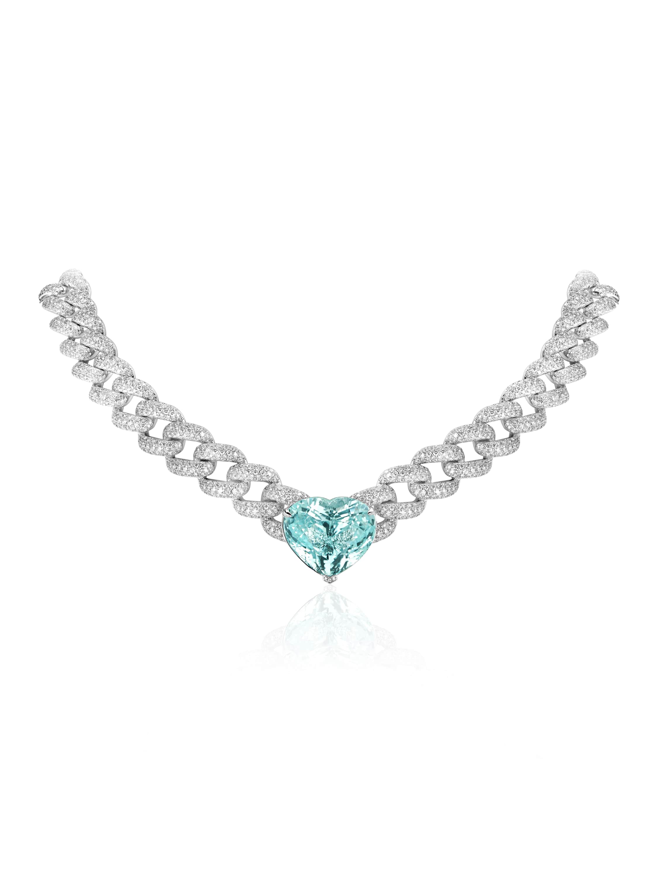 Necklace in the form of a large chain in 18K white gold, set with 2,392 diamonds with a total weight of 21.20 ct and a central Paraiba tourmaline insert in an extremely rare “Heart” cut weighing 33.08 ct.