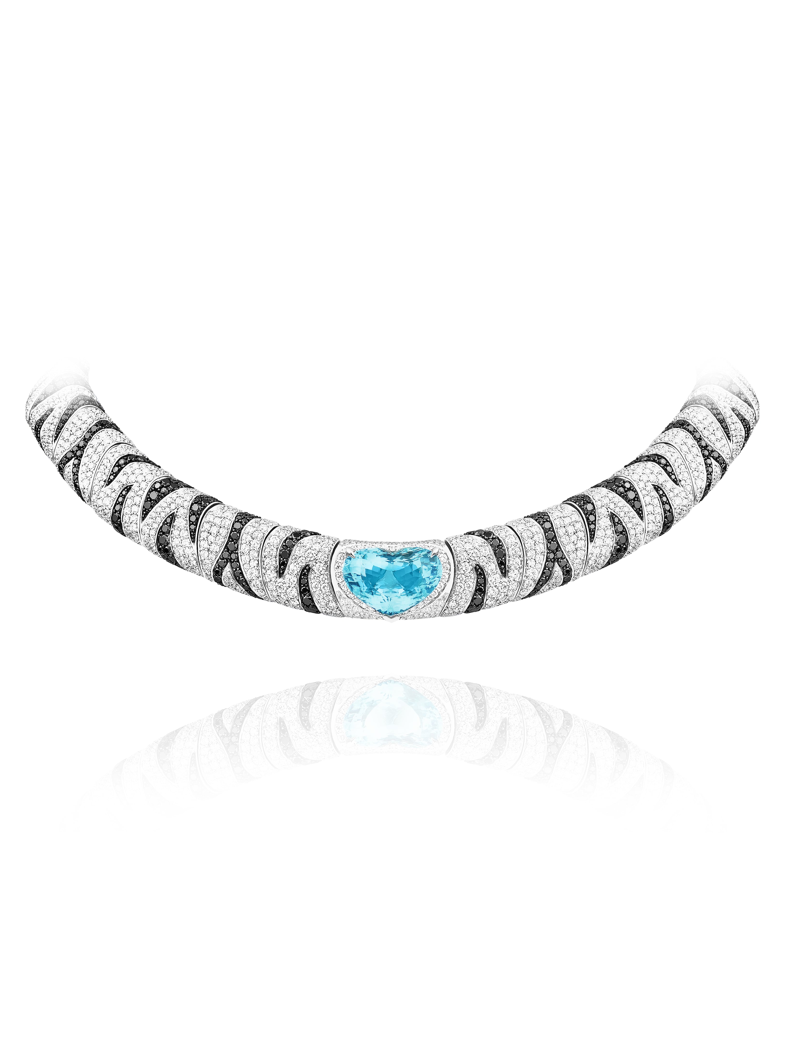 A white gold necklace set with a heart-cut Paraiba tourmaline weighing 14.63 ct, 1514 round brilliant-cut diamonds with a total weight of 23.31 ct, and 723 round brilliant-cut black diamonds with a total weight of 12.38 ct.