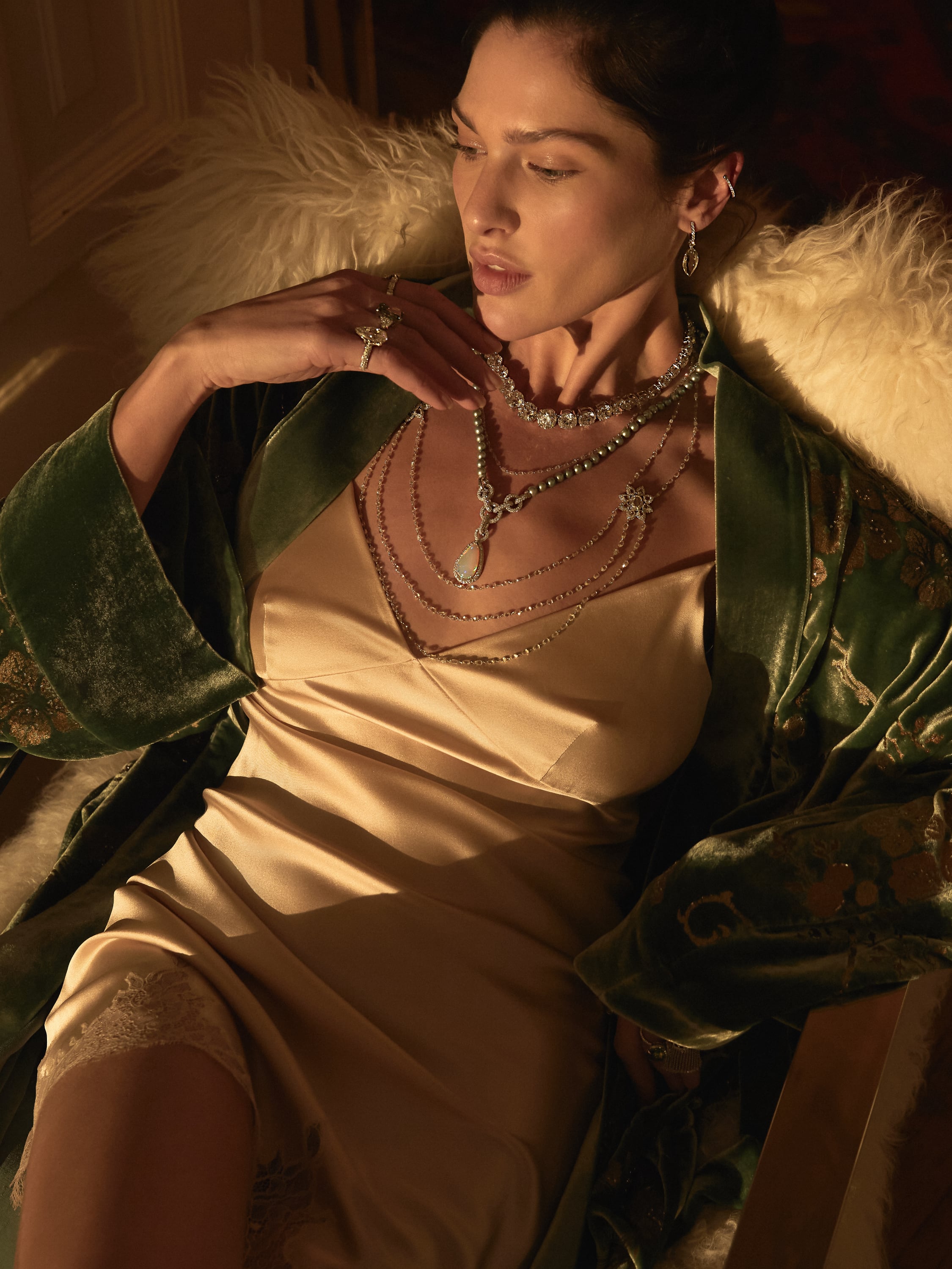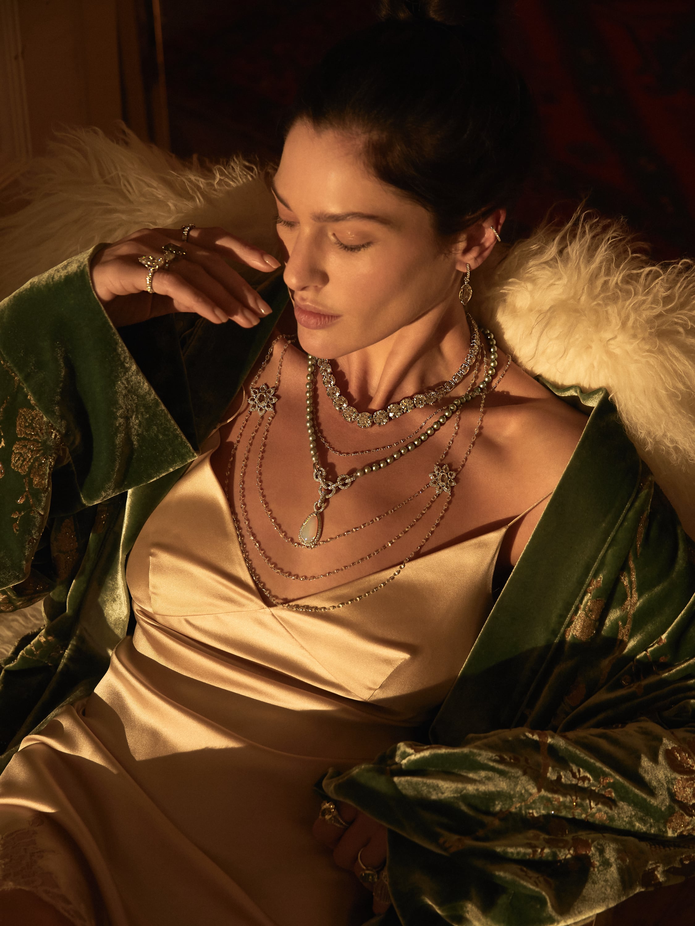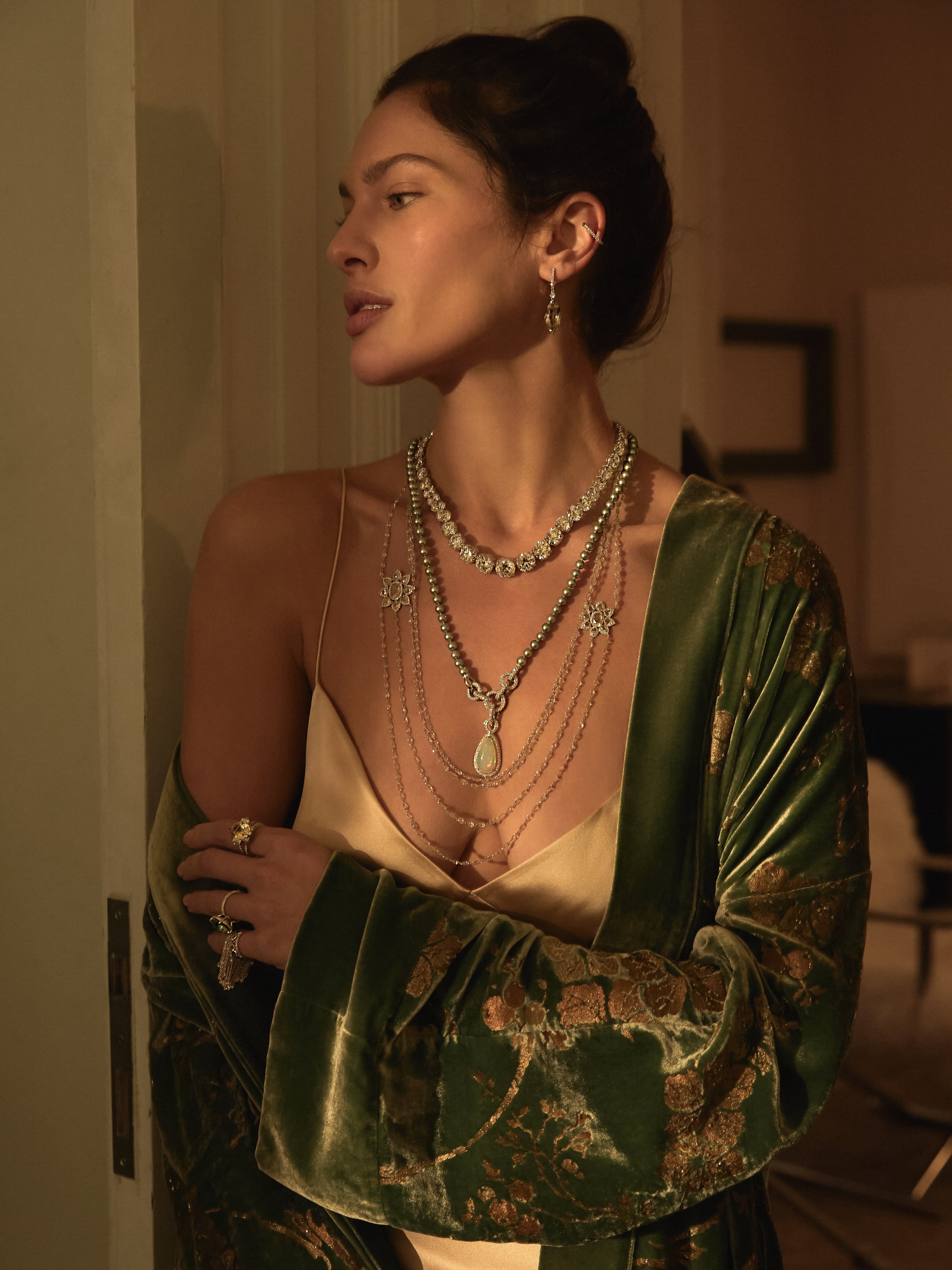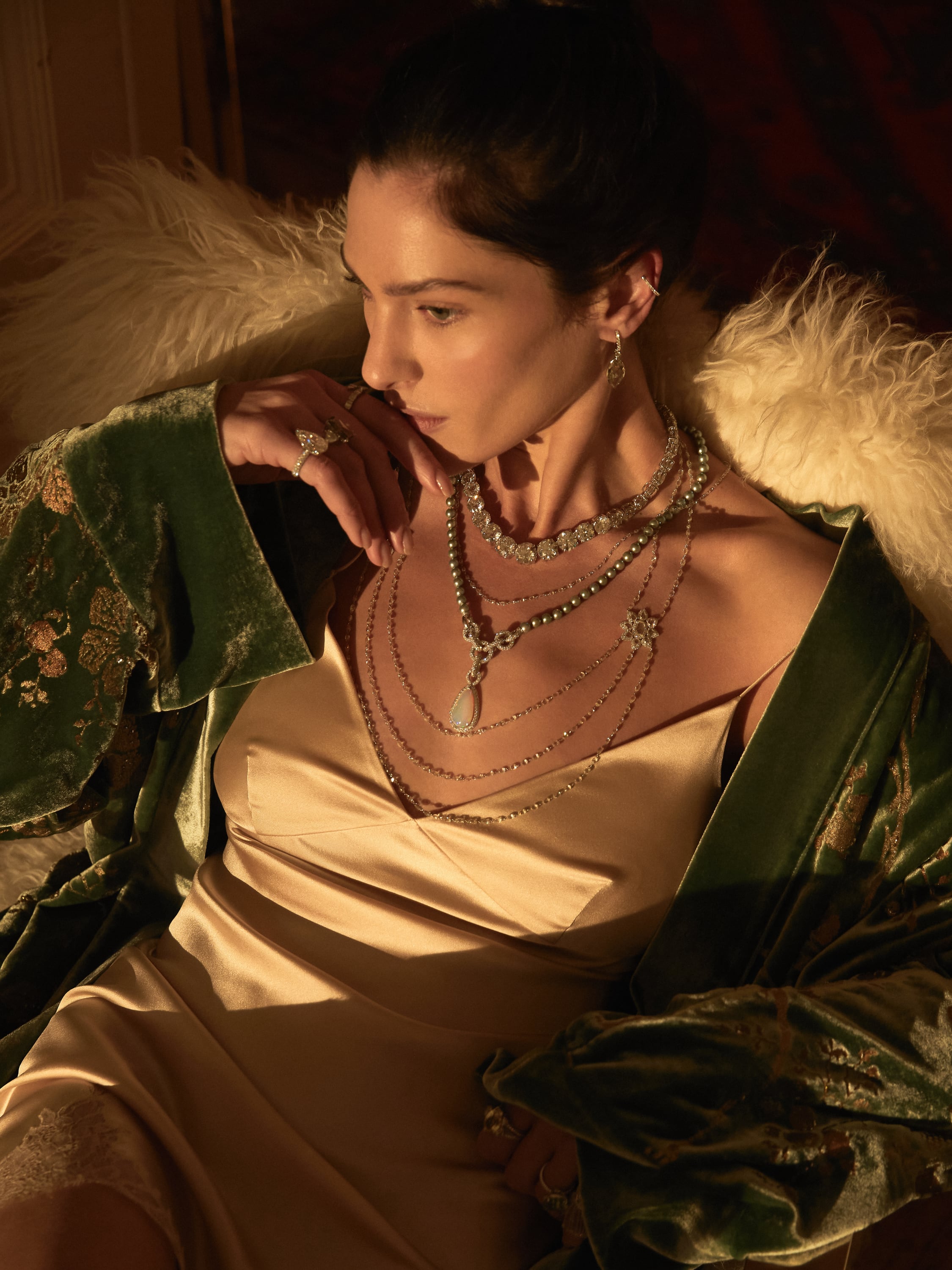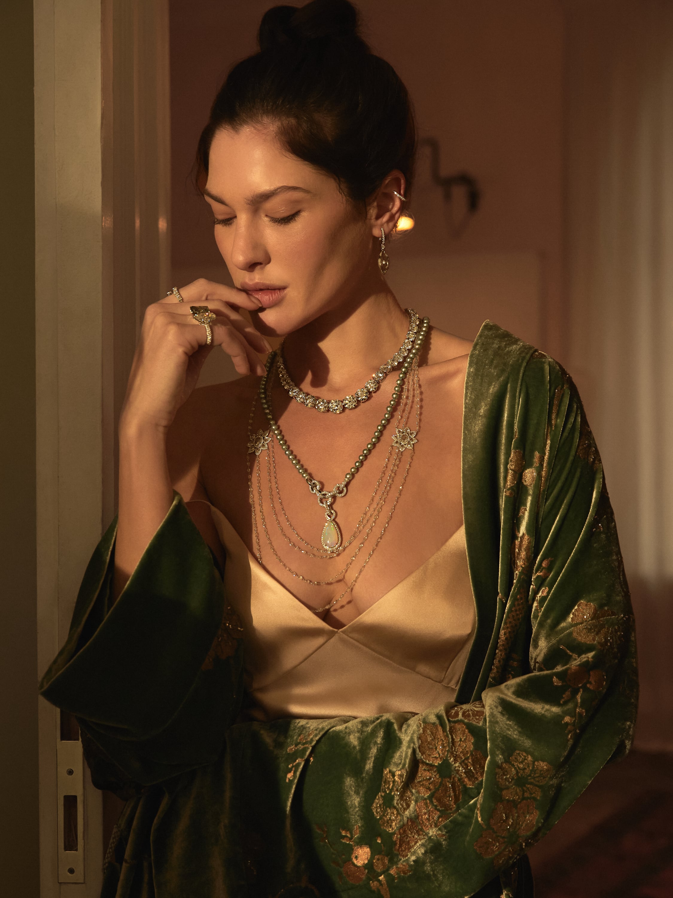 White gold necklace with 85 green Akoya pearls 35.16 g, d 6.0, an opal weighing 8.85 ct and 420 round-cut diamonds weighing 4.95 ct.