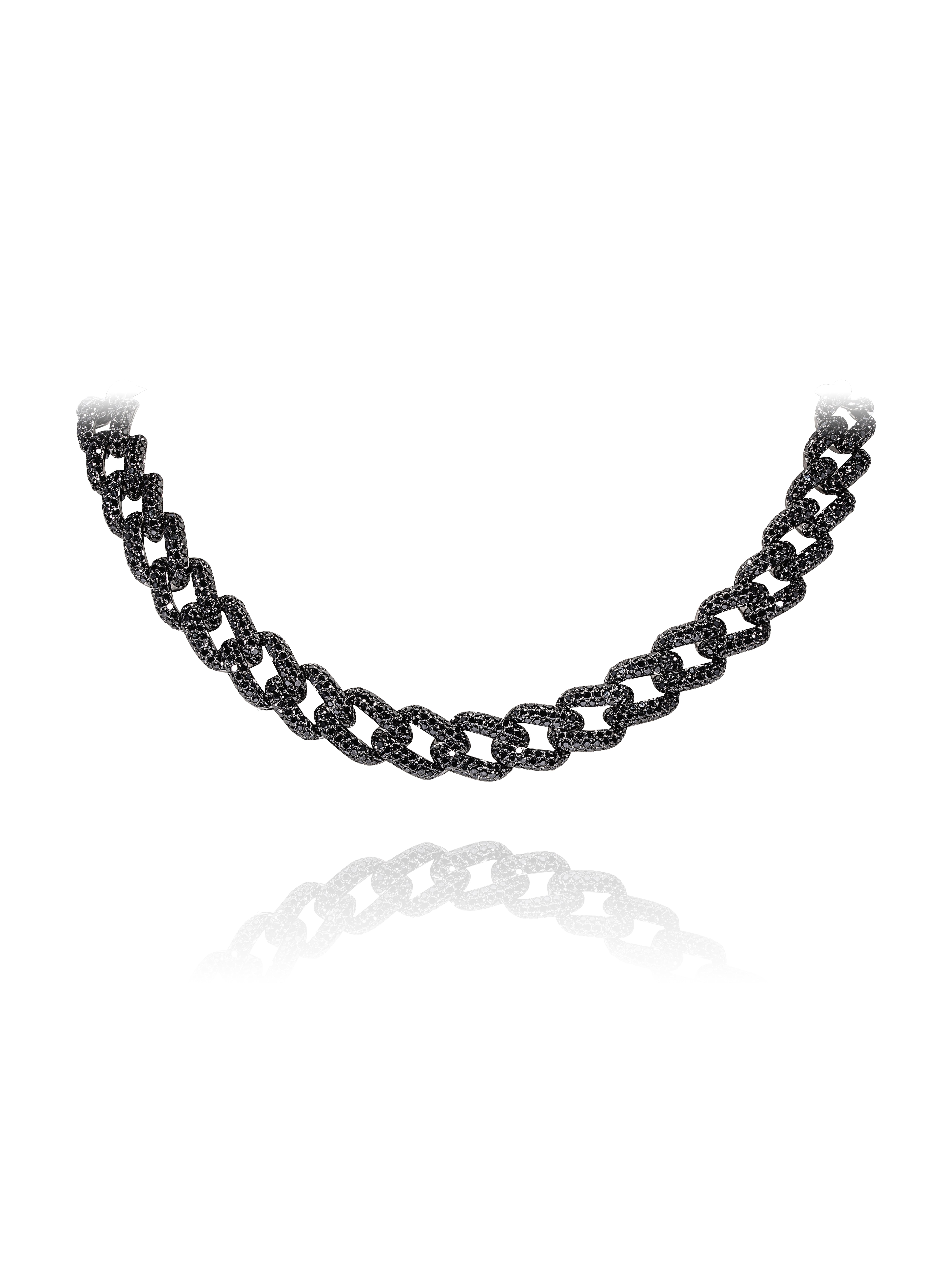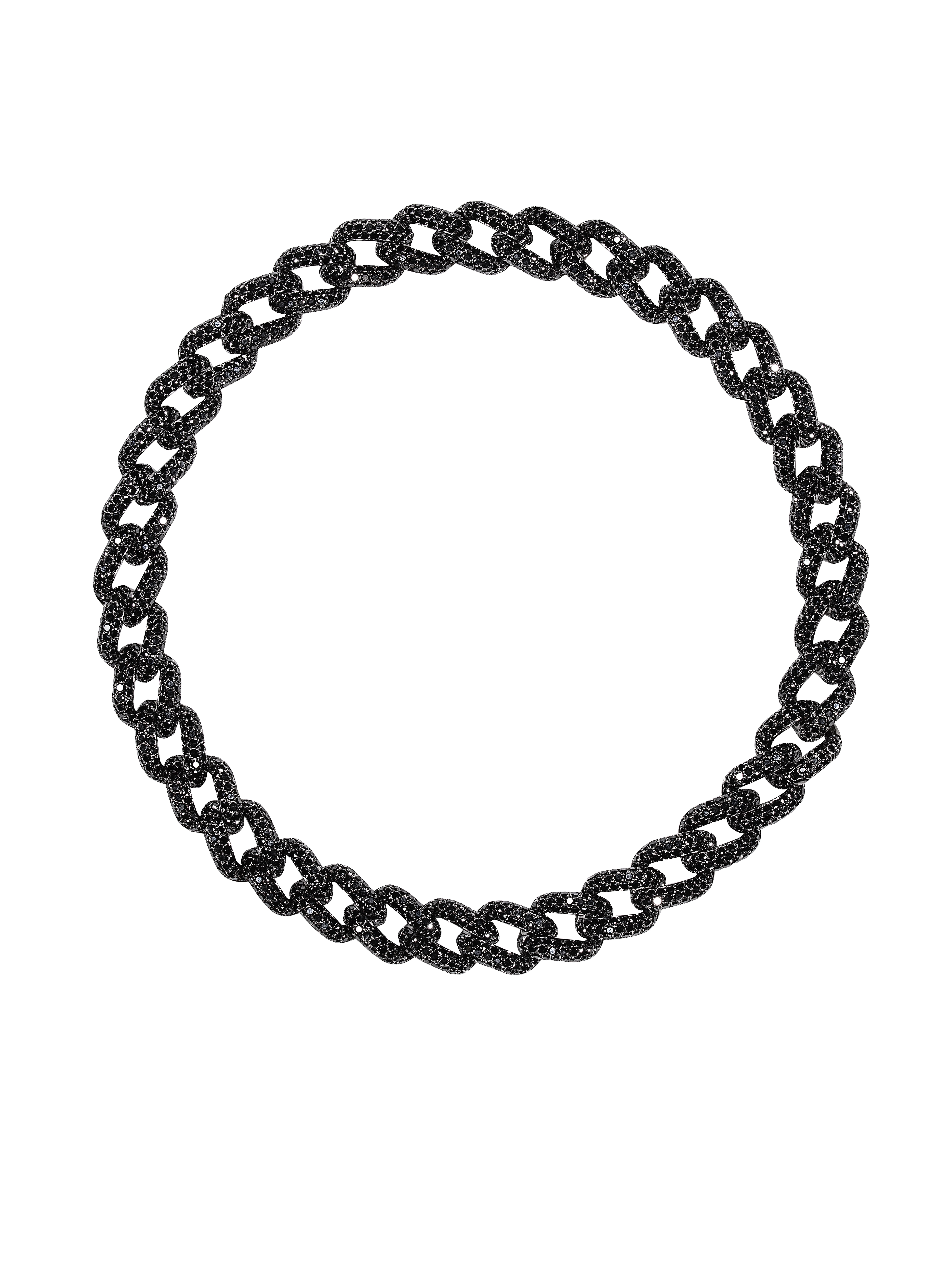 Necklace in 18K blackened gold, set with 2,583 round black diamonds with a total weight of 42.4 ct, 6 pear-shaped diamonds with a total weight of 0.89 ct, and 1 black oval diamond weighing 0.94 ct.