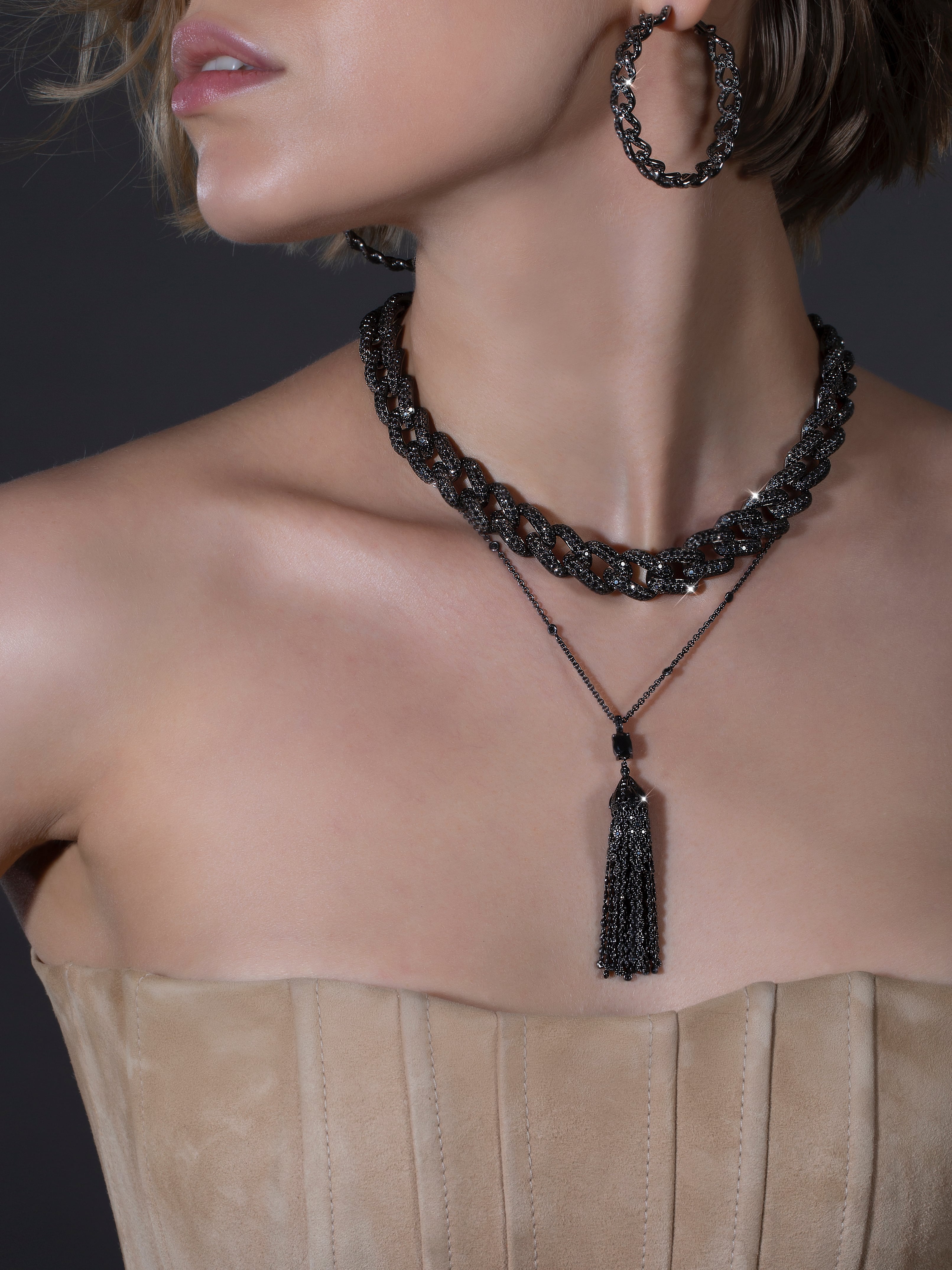 Necklace in blackened gold with diamonds and a removable tassel pendant