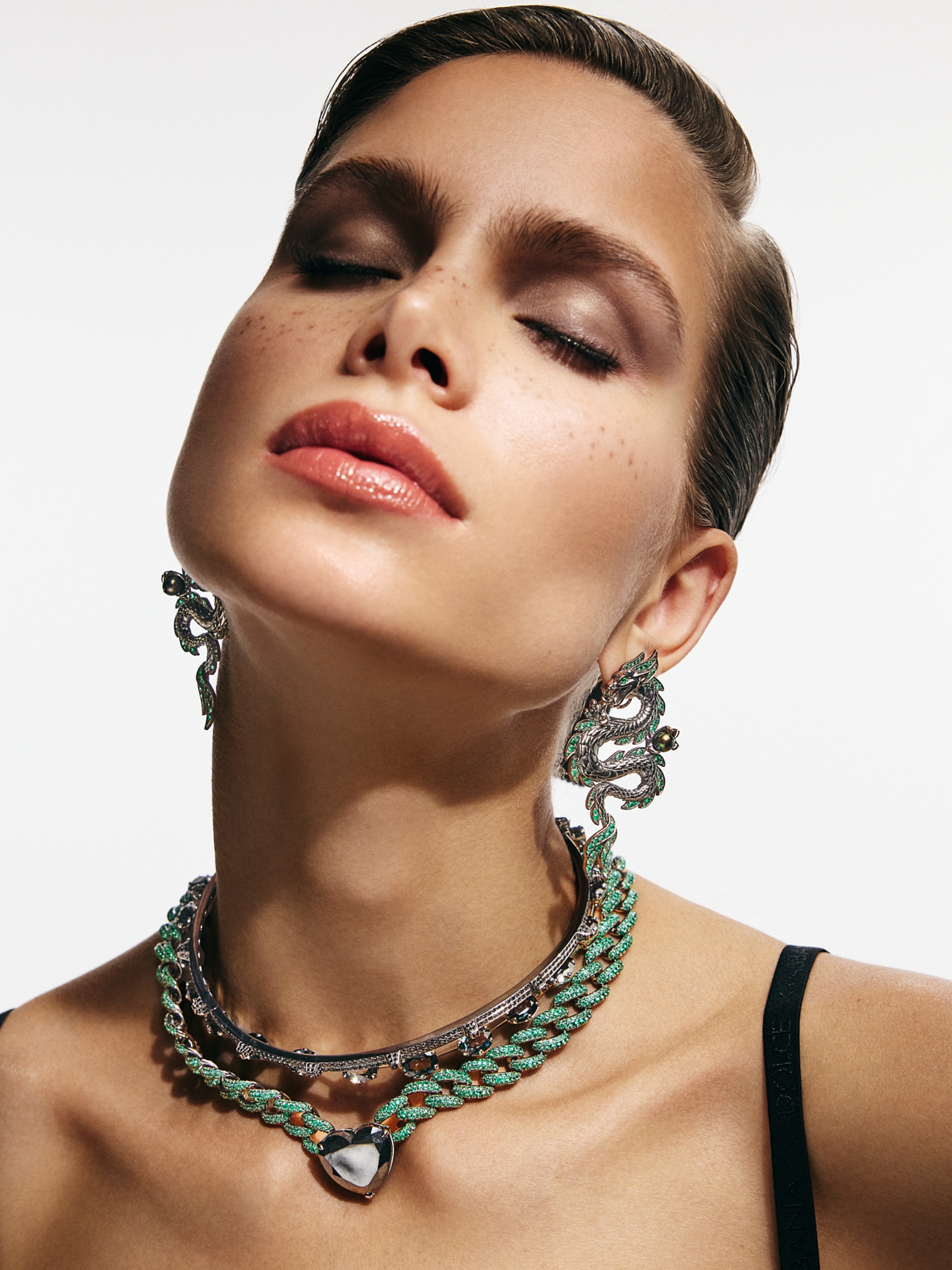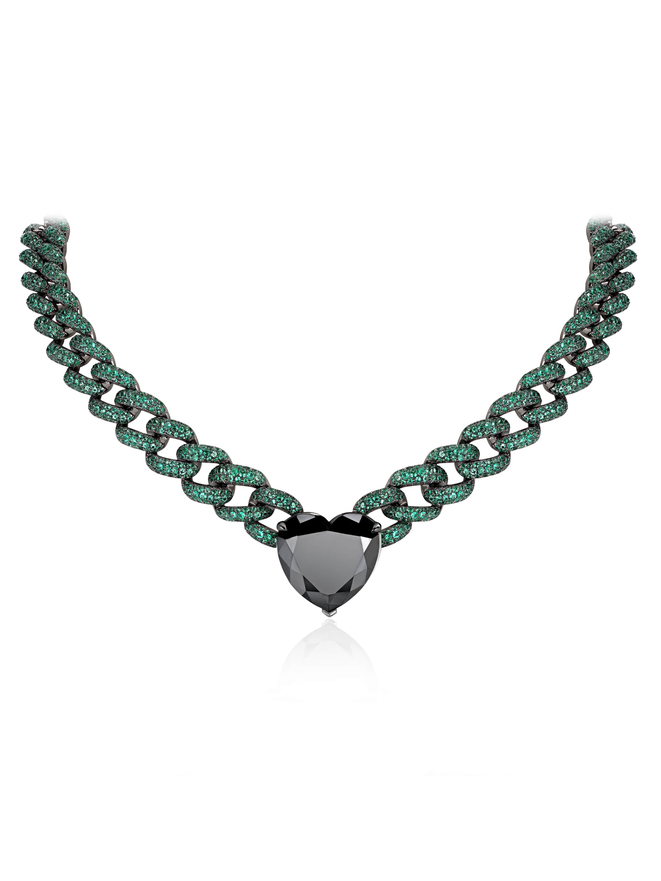 Blackened gold necklace with a heart-cut black diamond weighing 30.21 ct and 2,404 emeralds totaling 14.33 ct.