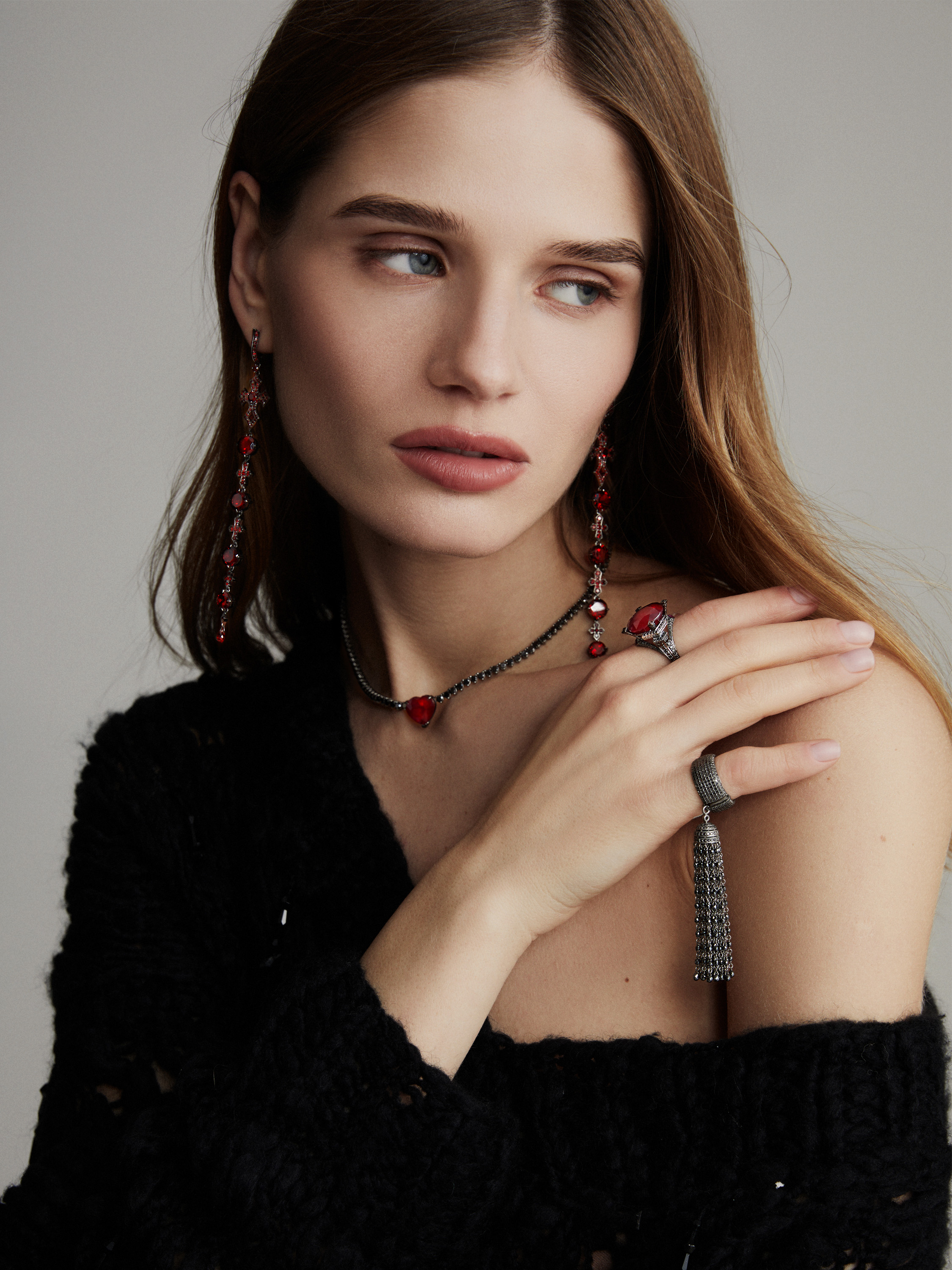 Necklace in blackened gold, inlaid with a heart-cut ruby weighing 8.01 ct and 206 black round-cut diamonds with a total weight of 9.15 ct.