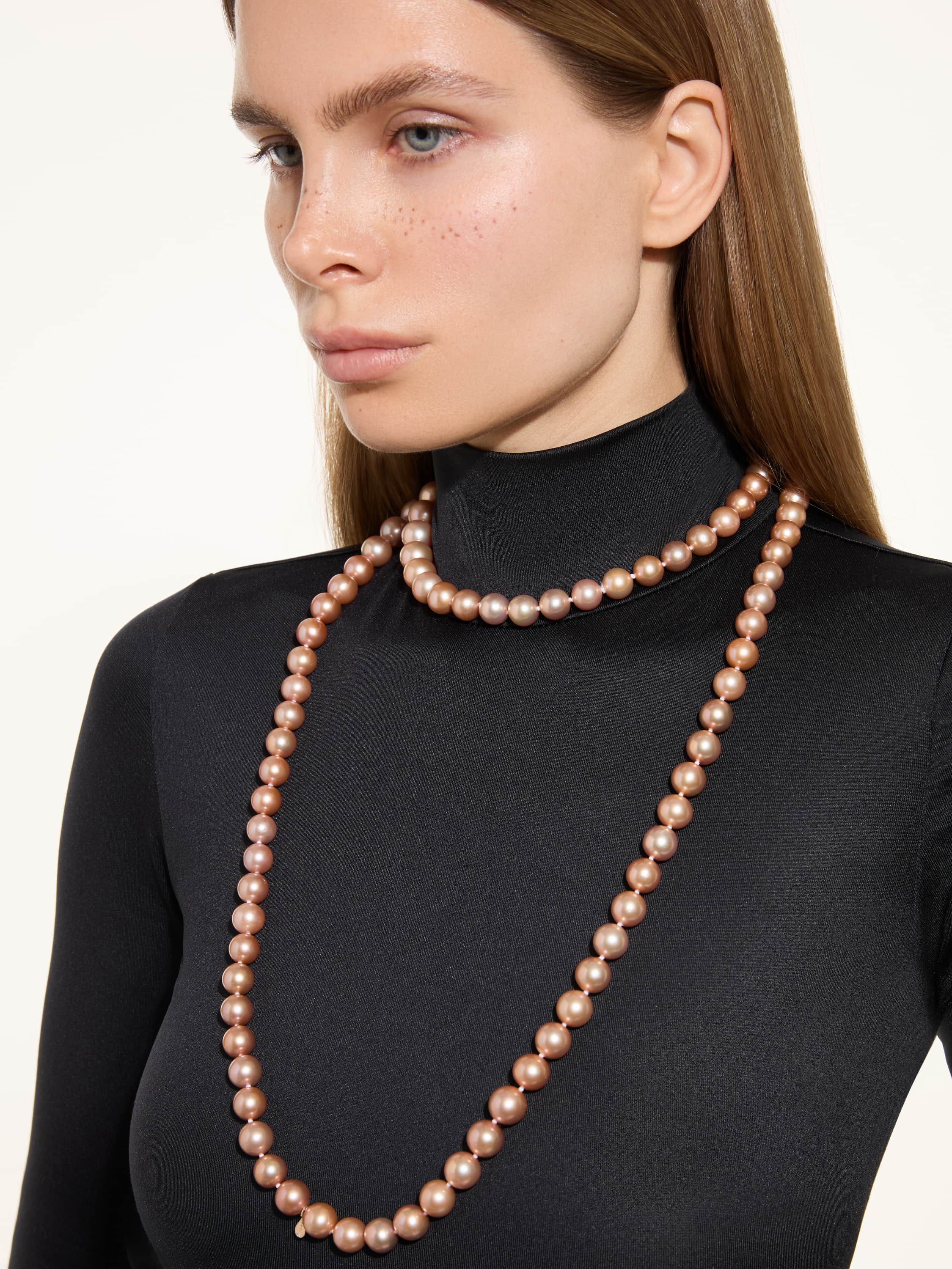 Rose gold necklace with 106 pearls in a rare orange-pink hue weighing 235.1 g, diameter 11.0–13.0, and 1 LG round-cut diamond weighing 0.01 ct.