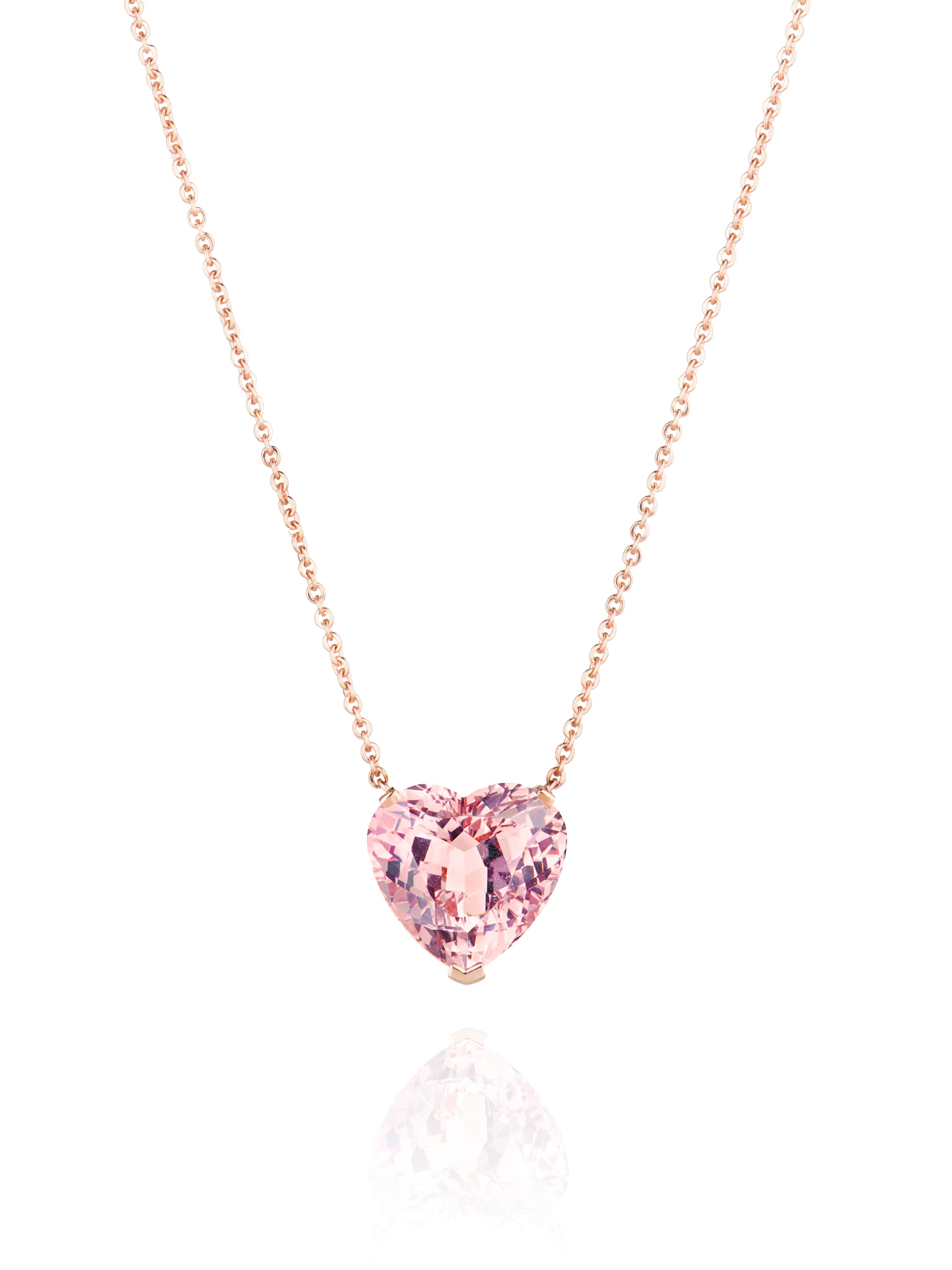 Necklace in rose gold with a heart-cut morganite weighing 15.87 ct, 163 round diamonds with a total weight of 0.77 ct, and 1 briolette weighing 0.06 ct.
