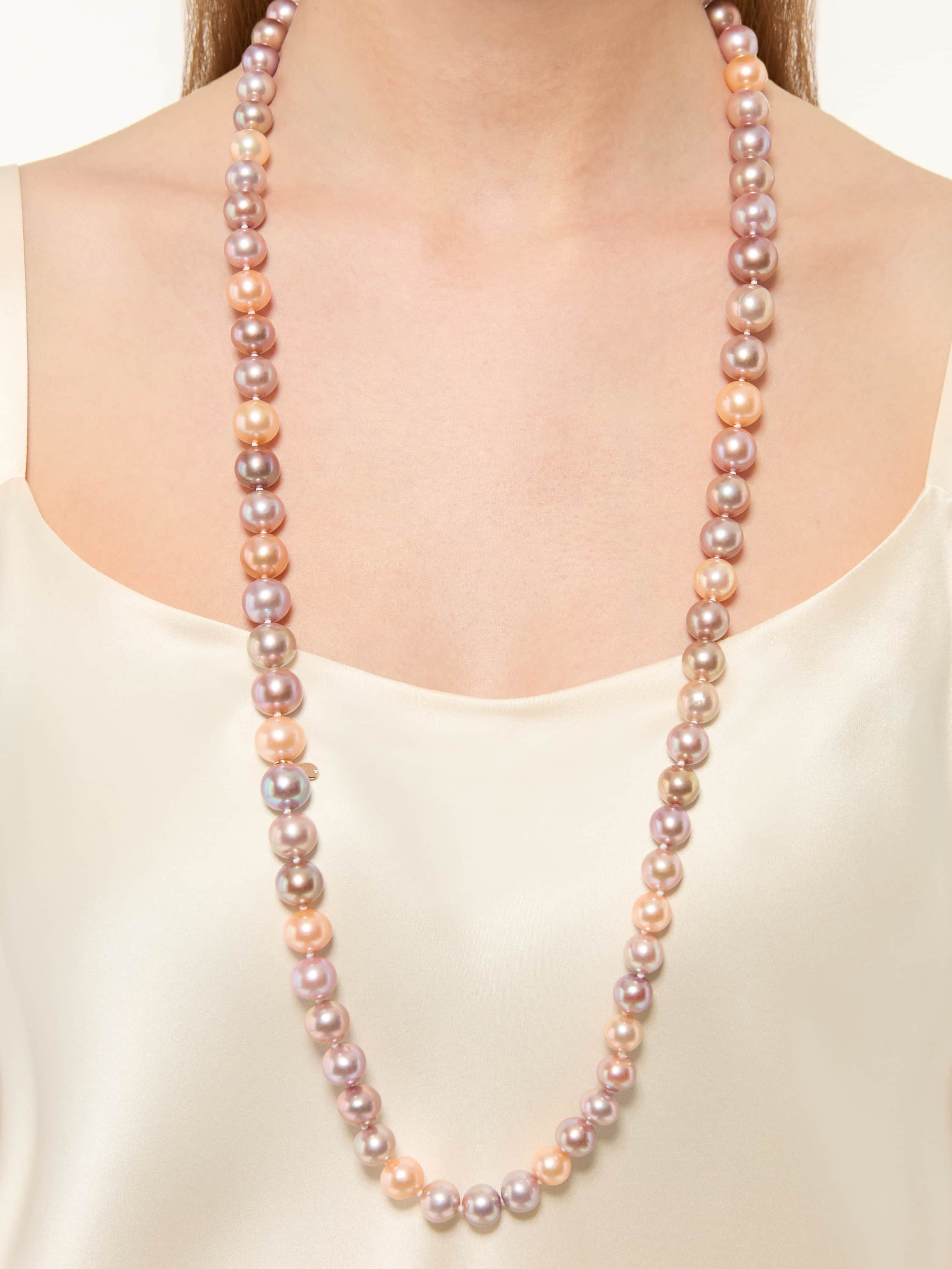 Rose gold necklace with 75 pearls weighing 151.79 g, diameter 10.0–13.5, and 1 LG round-cut diamond 0.01 ct.