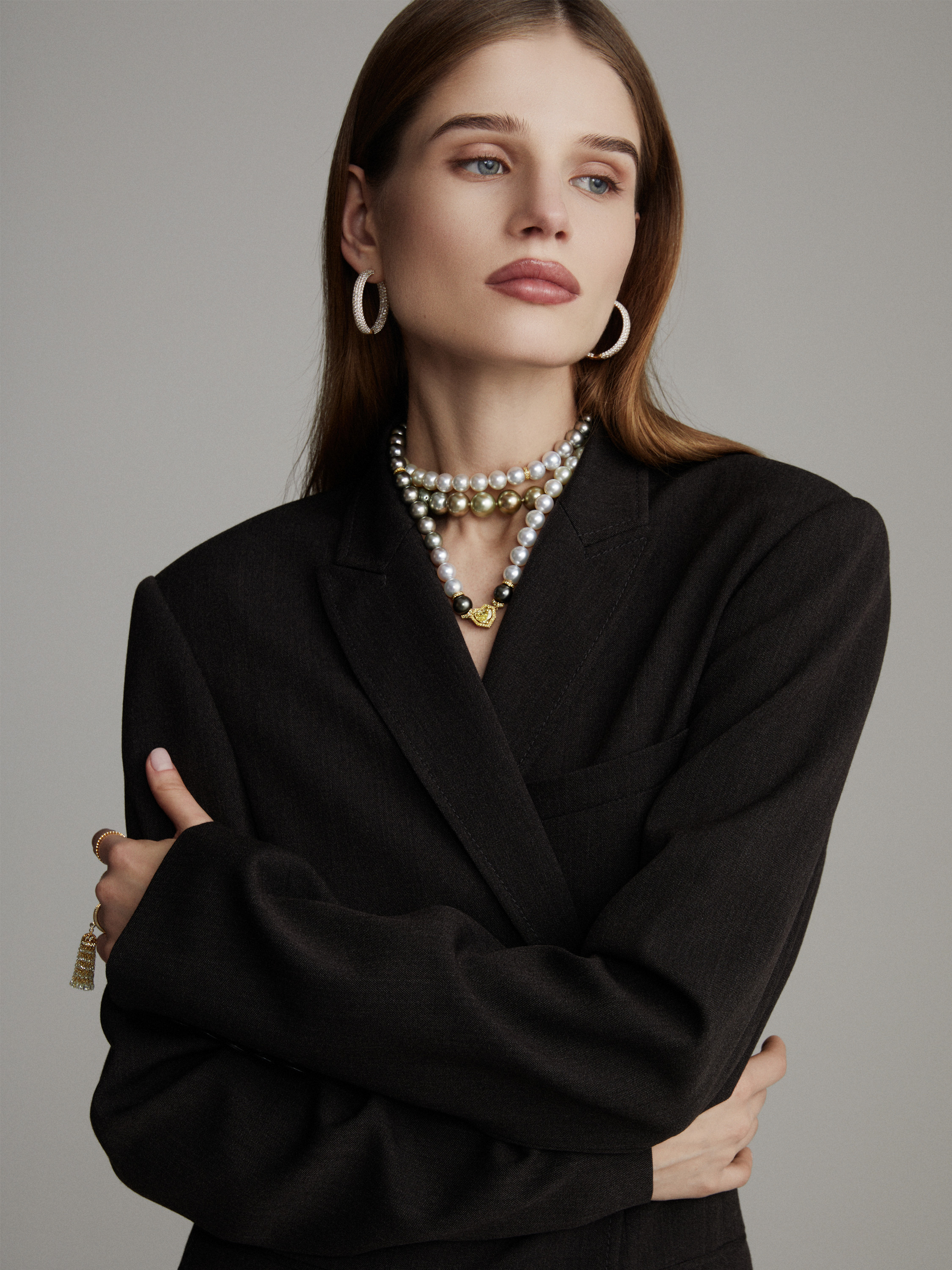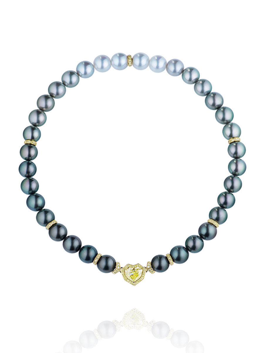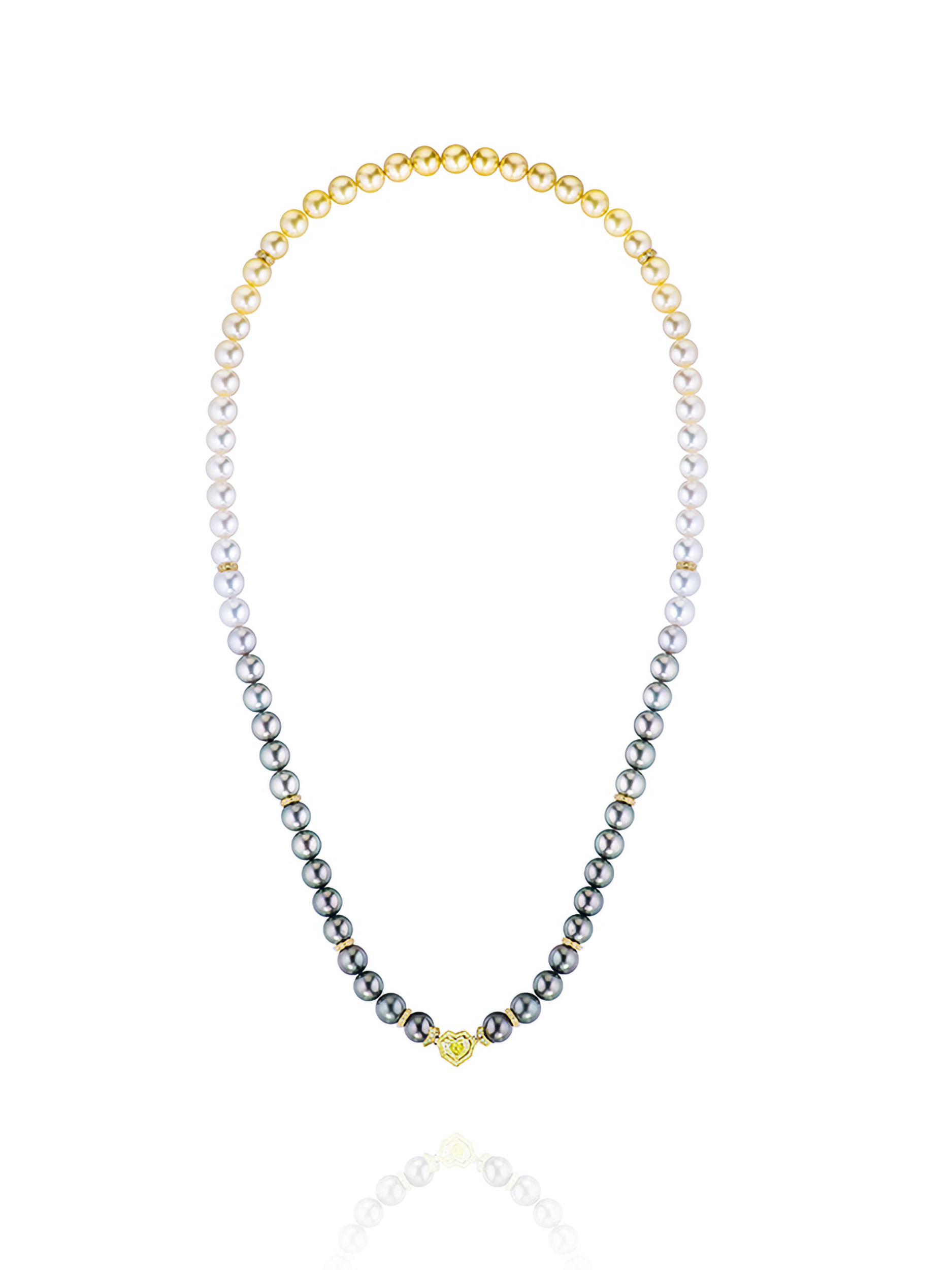 A transformable necklace in yellow gold, set with a yellow diamond (Fancy Intense Yellow shade) in a heart cut weighing 2.11 ct, 280 round yellow diamonds with a total weight of 2.27 ct, and 71 pearls weighing 61.25 g and measuring 10.2–10.9 mm in diameter.