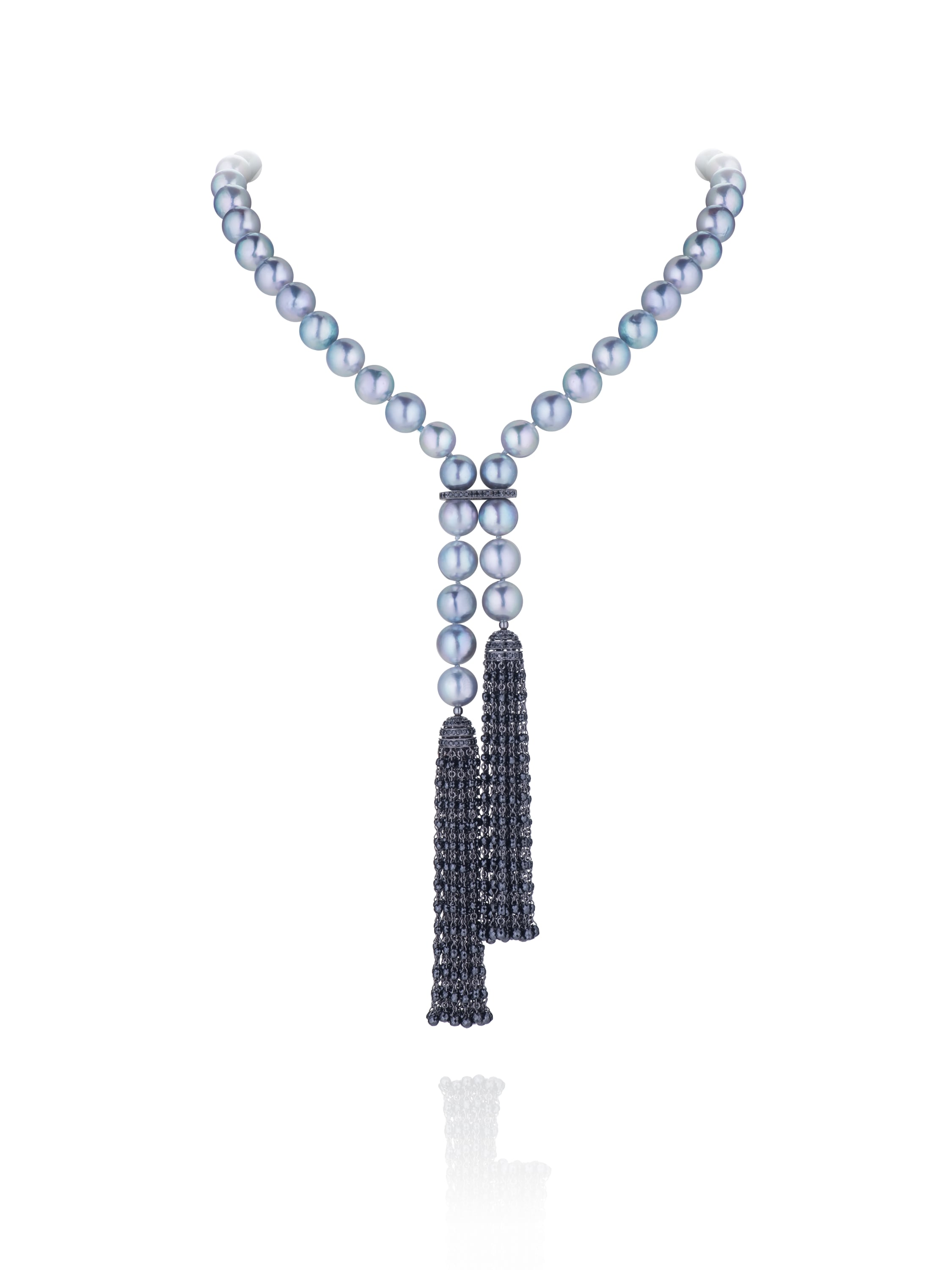 Necklace-belt in blackened 750 gold with 48 Akoya grey pearls 41.66 g d 8.0–8.5, 650 black briolette-cut diamonds weighing 40.33 ct, and 163 black round-cut diamonds weighing 0.72 ct. Total diamond weight in the piece is 41.05 ct.