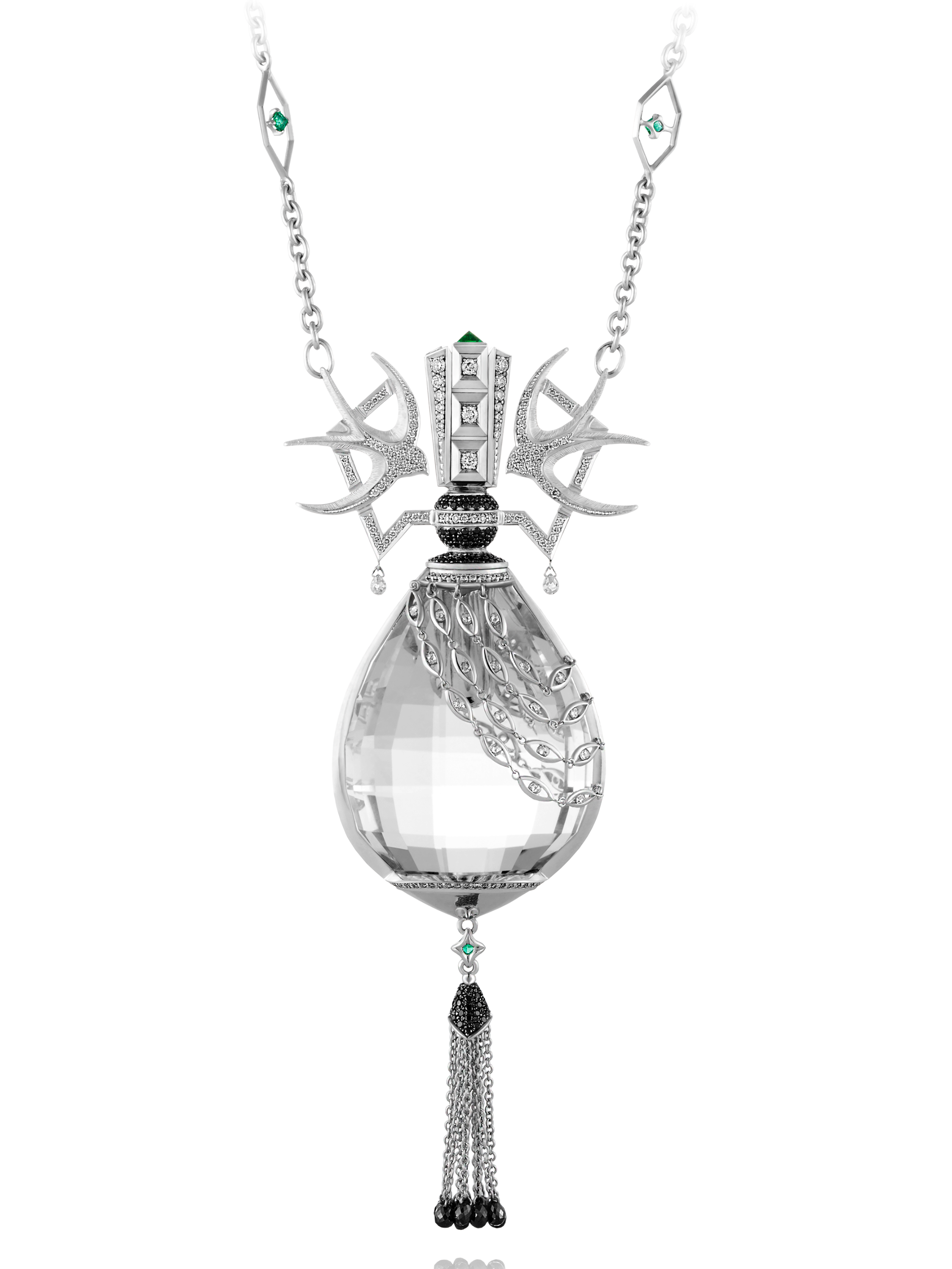 Vinaigrette necklace in white gold with quartz weighing 155.31 ct, 12 black diamonds of briolette cut weighing 2.14 ct, 2 briolette-cut diamonds weighing 0.20 ct, 36 rose-cut diamonds, 3 emeralds weighing 1.71 ct, 13 square emeralds weighing 1.06 ct, 364 round diamonds weighing 2.01 ct, 263 black round-cut diamonds weighing 1.22 ct. Total diamond weight: 6.05 ct.
