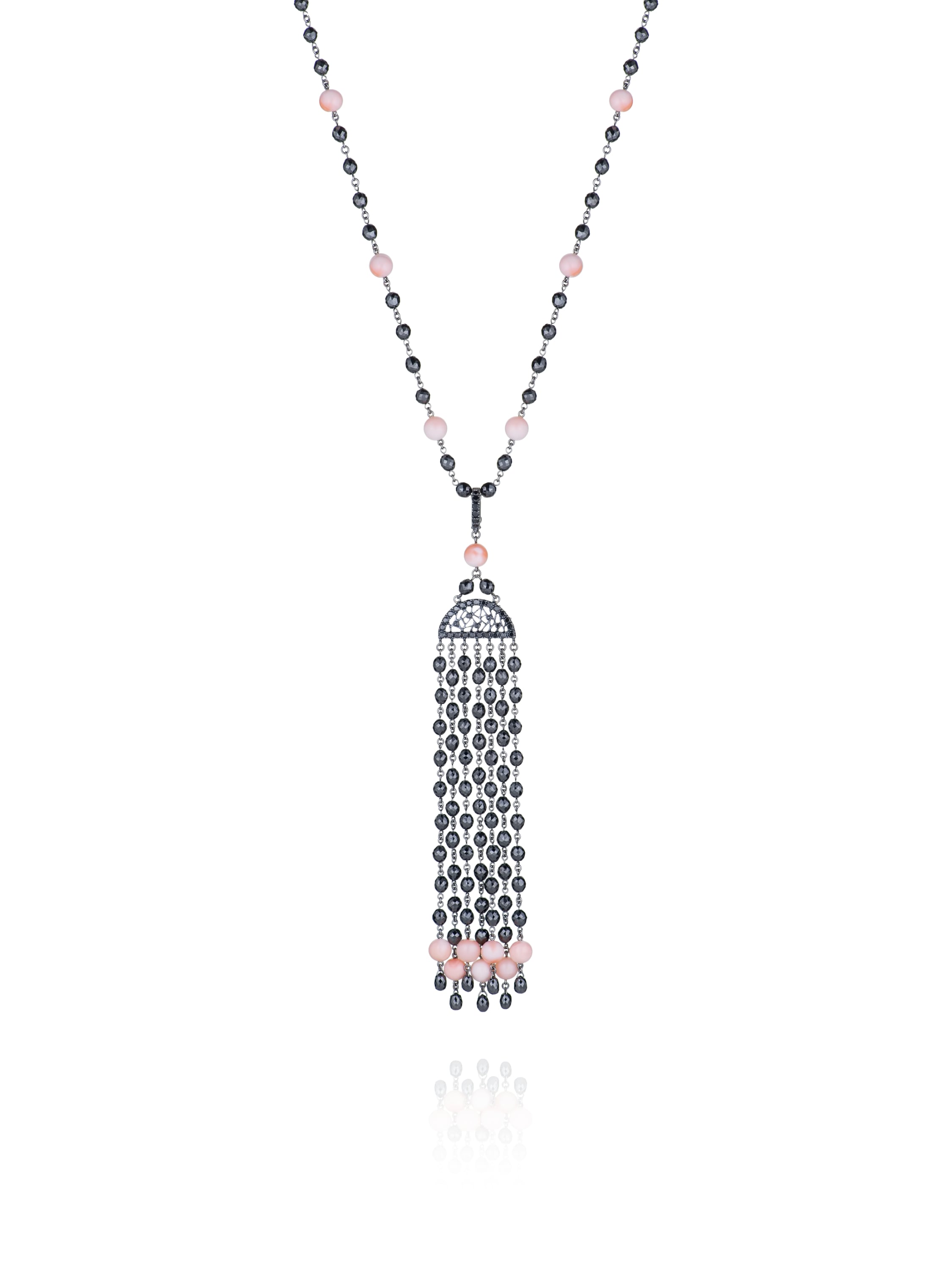 Necklace with a pendant in oxidized gold with 130 beads of black diamonds 40.47 ct, 7 briolette-cut diamonds weighing 1.84 ct, 125 round black diamonds weighing 0.90 ct and 25 coral beads 23.24 ct d 5.0.