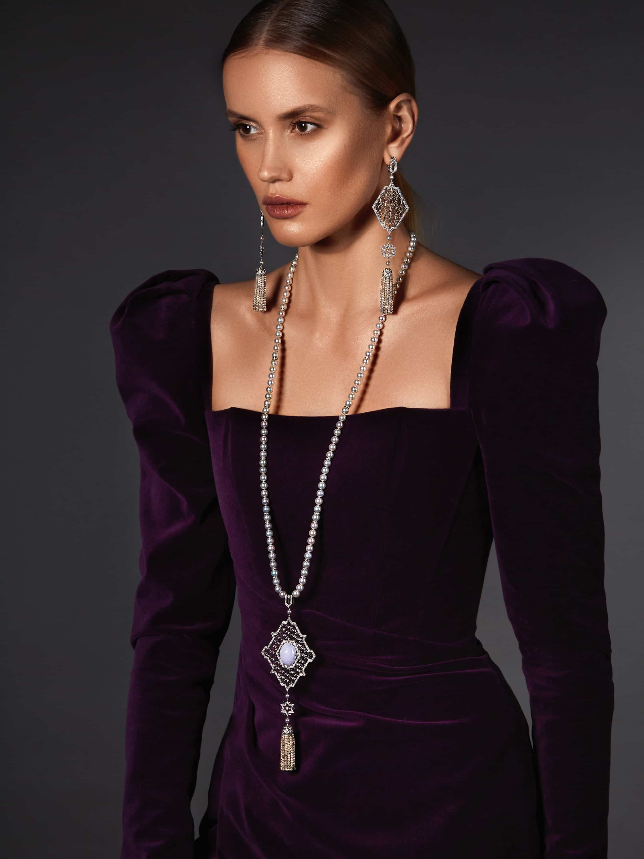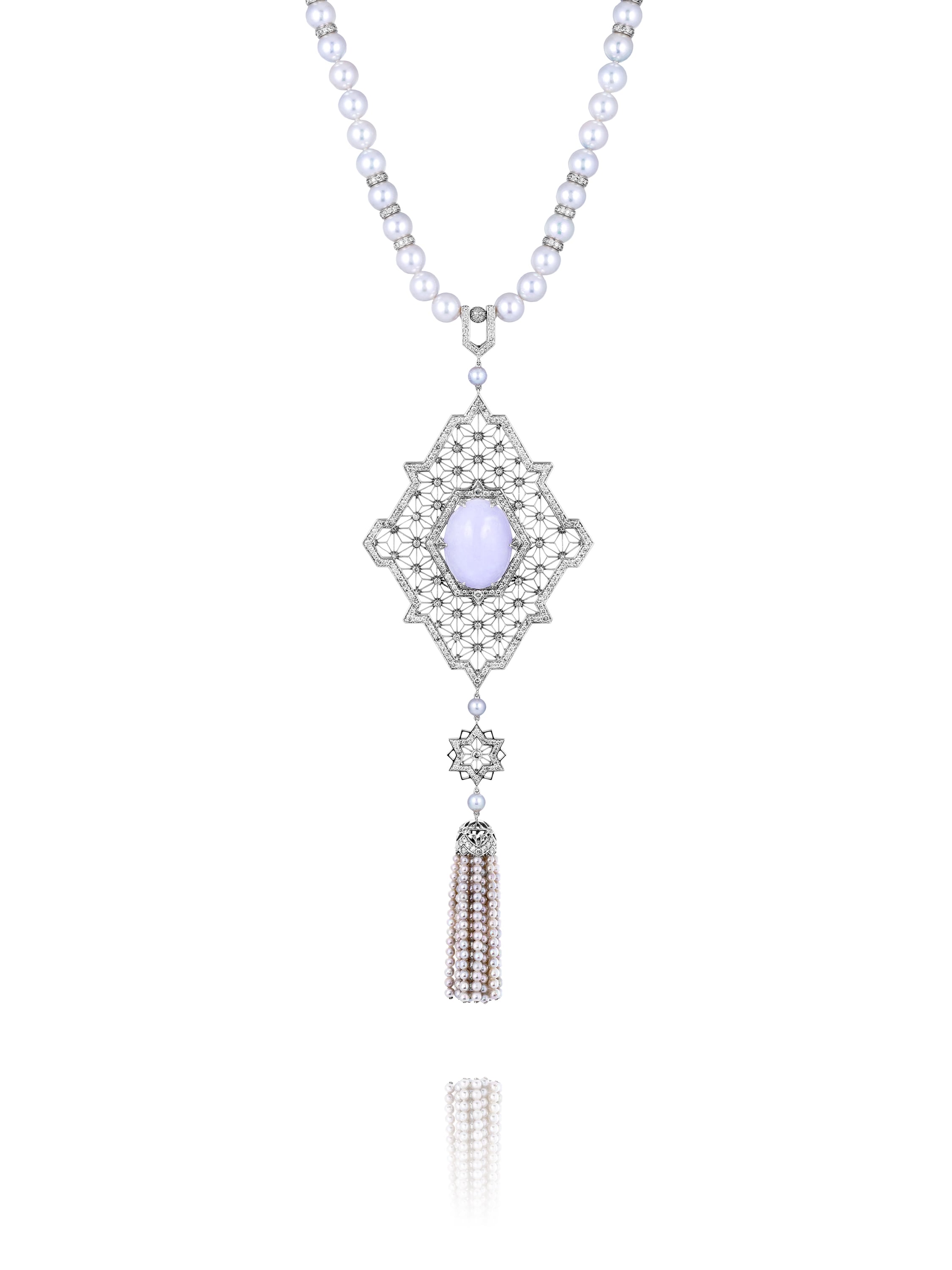 Necklace in palladium with a tassel pendant, inlaid with jadeite weighing 21.63 ct, 258 pearls with a total weight of 5.07 g and a diameter of 2.4, 4.5 mm, 118 grey Akoya pearls with a total weight of 52.18 g and a diameter of 6.5–7.0 mm, 624 grey round-cut diamonds with a total weight of 4.76 ct.