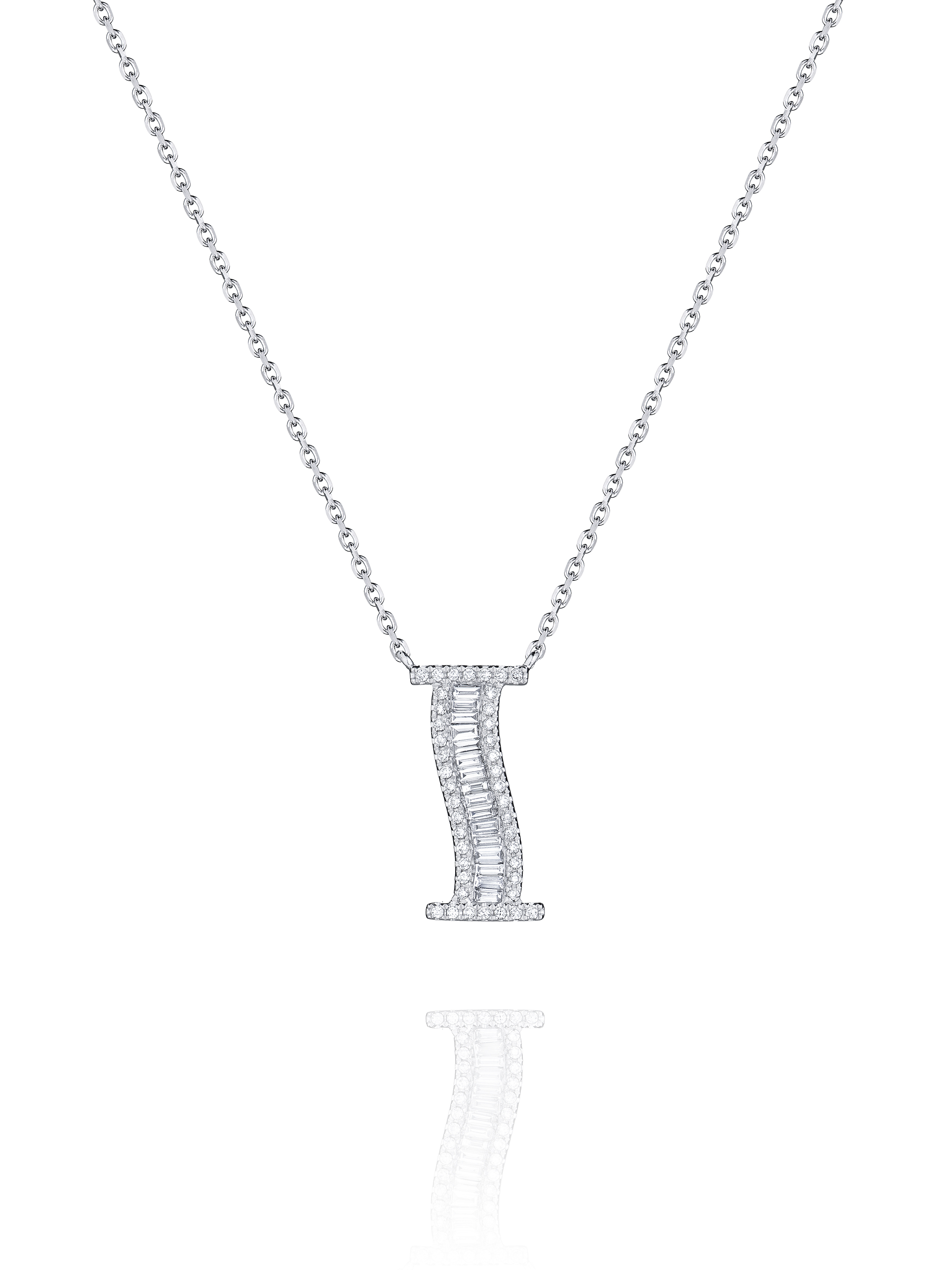 Necklace with an I‑shaped pendant in white gold, set with 42 round diamonds with a total weight of 0.12 ct and 11 baguette‑cut diamonds with a total weight of 0.23 ct.