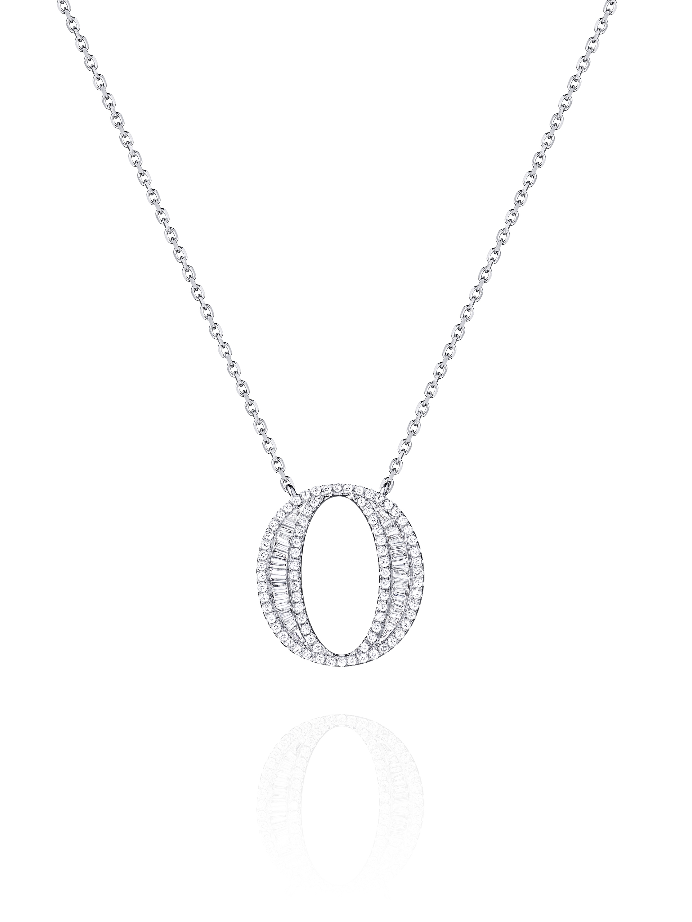 Necklace with pendant made of white gold in the shape of the letter O, inlaid with 78 round diamonds with a total weight of 0.27 ct and 26 baguette-cut diamonds with a total weight of 0.25 ct.