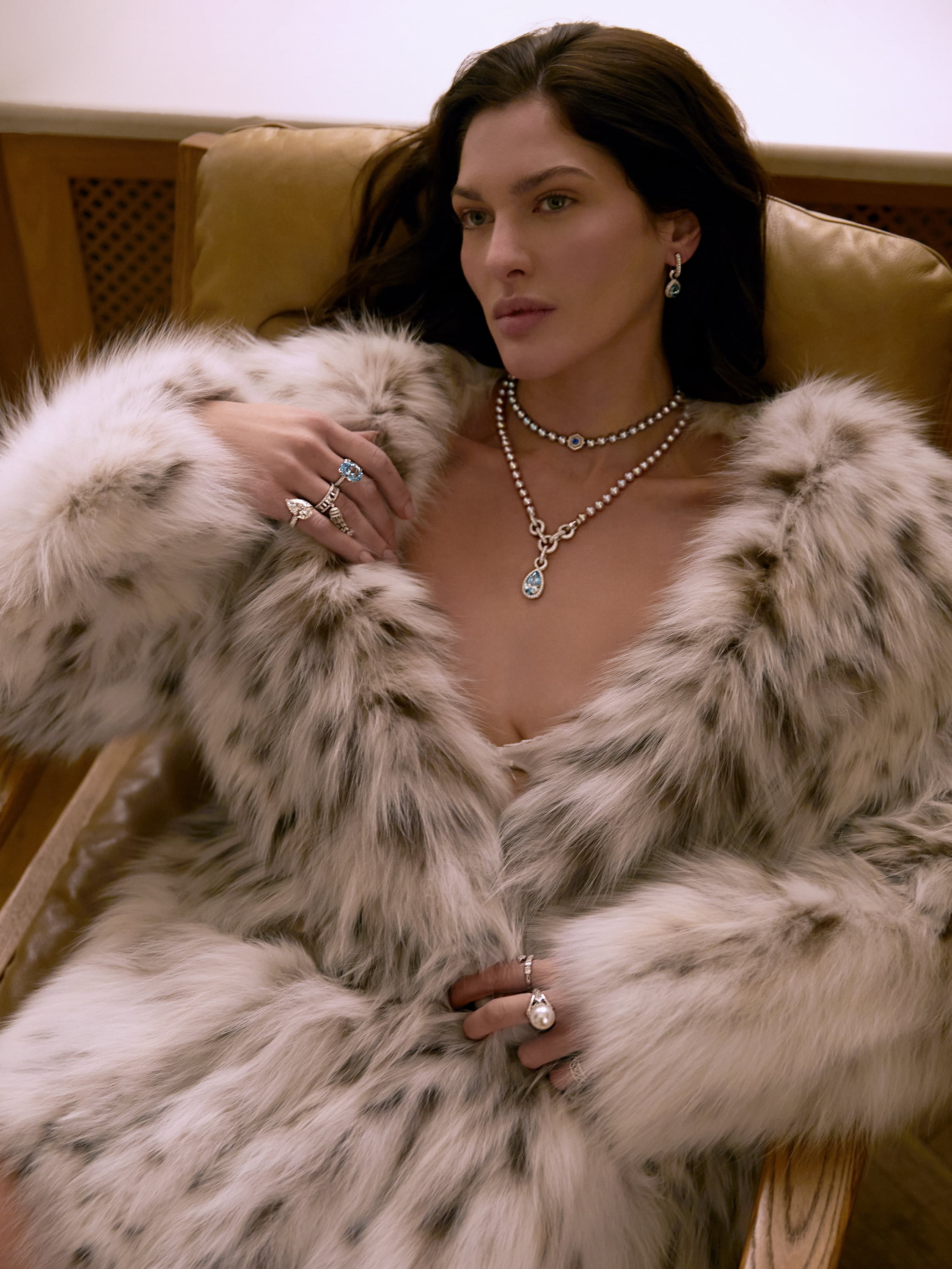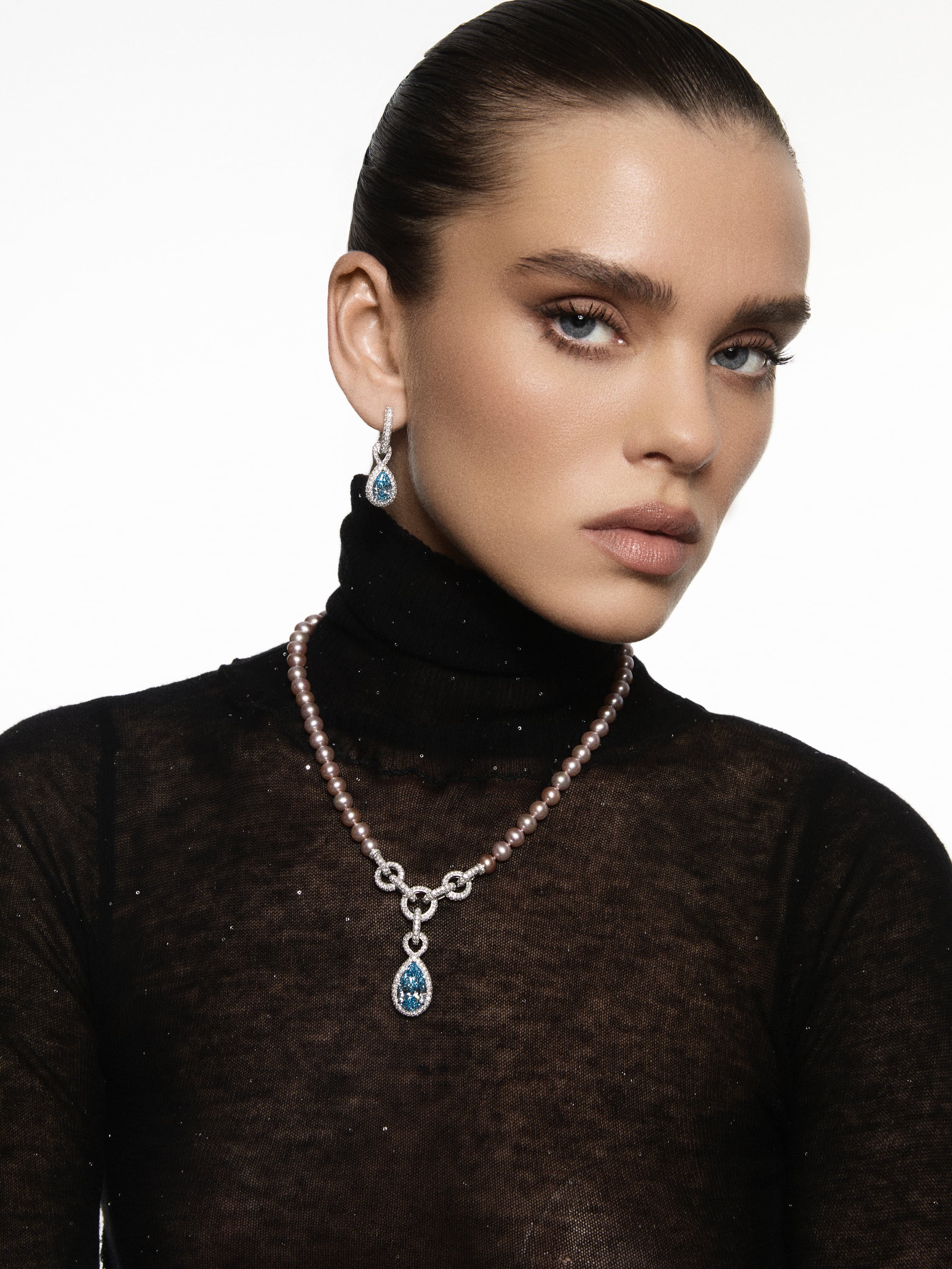 White gold pendant necklace with a 7.50 ct VS1 blue lab-grown diamond, 54 pink pearls 33.87 g d 8.0-8.5 and 422 round-cut diamonds weighing 5.57 ct.