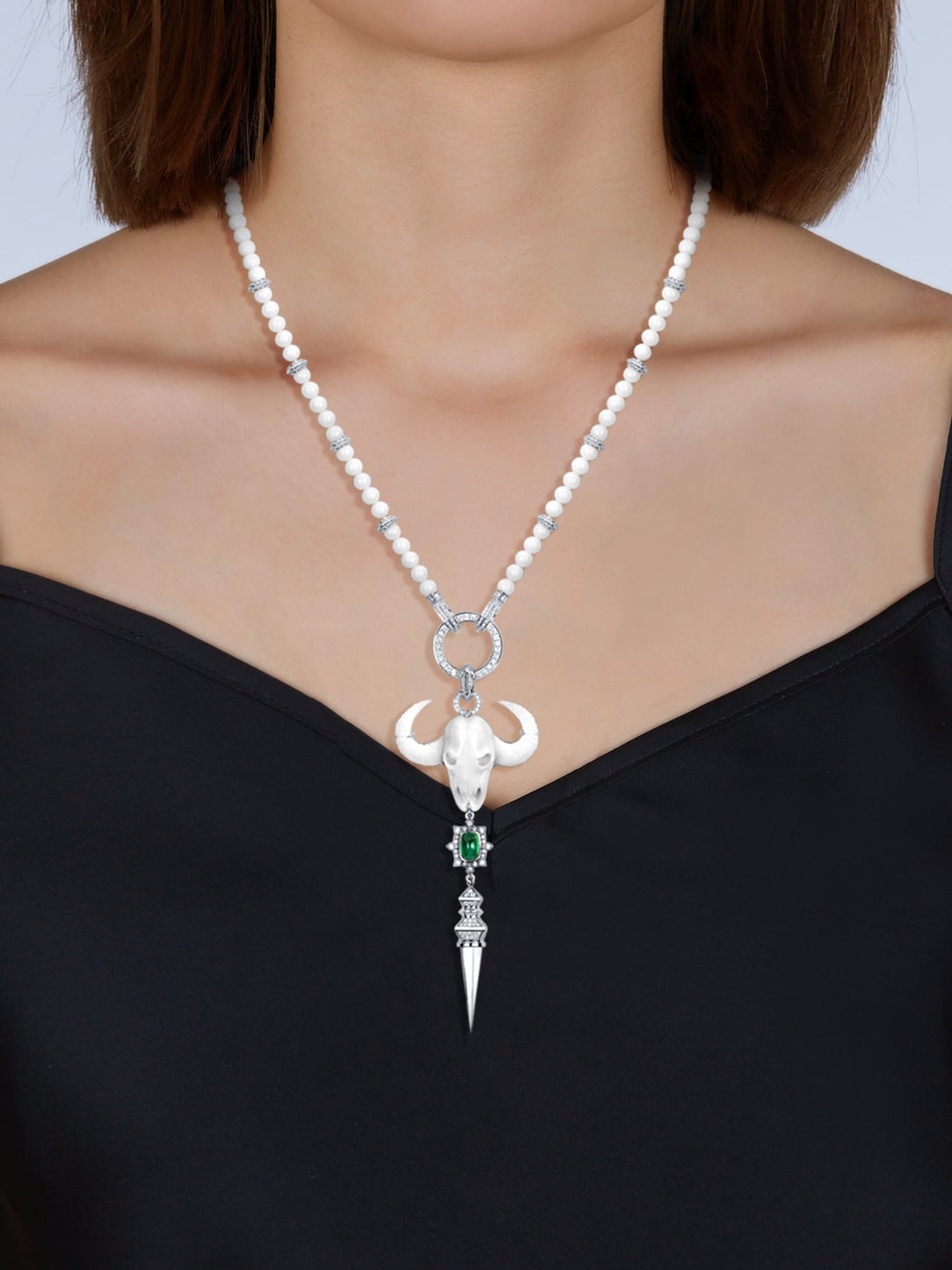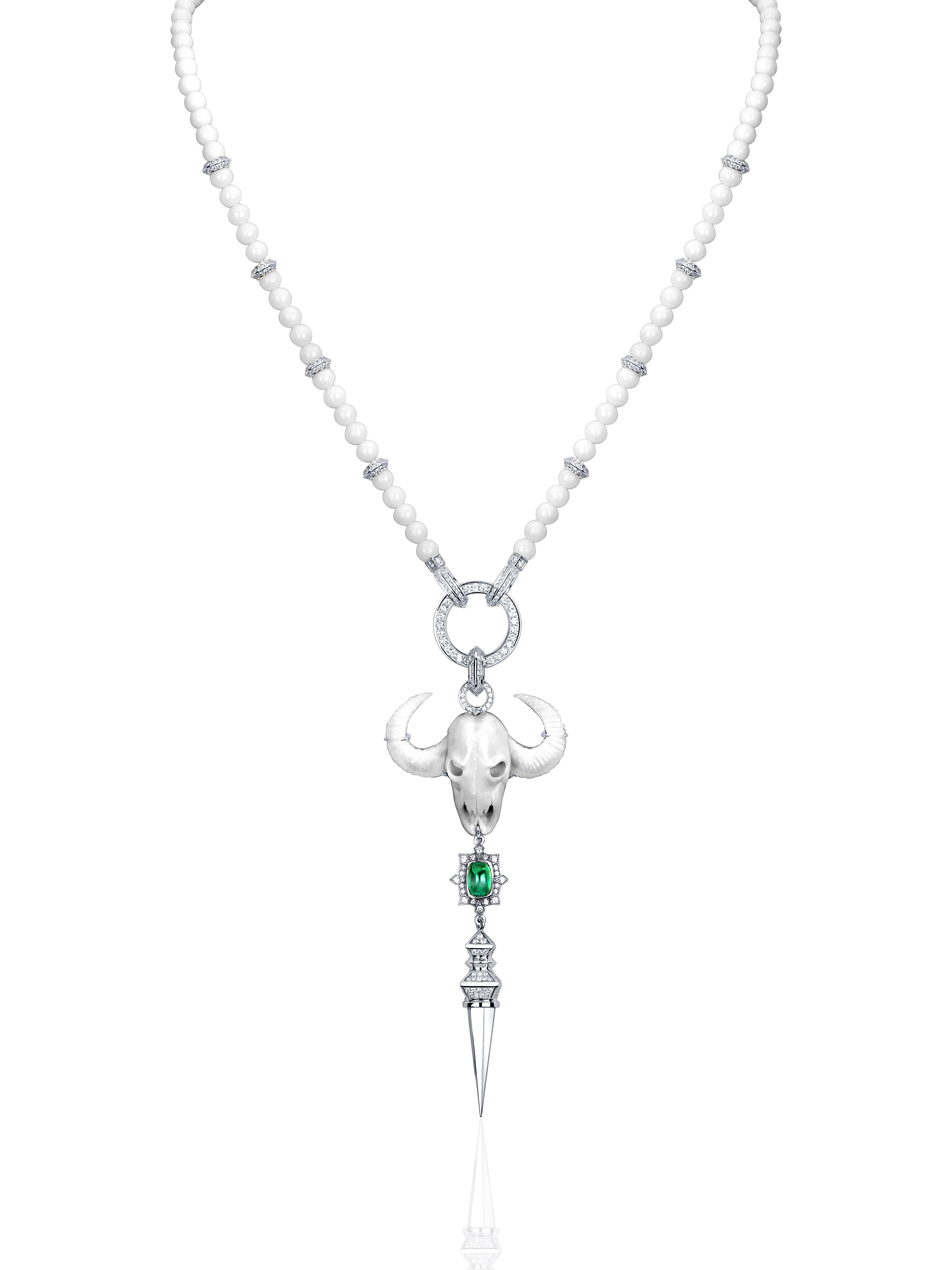 Necklace with a pendant in white gold with a cabochon‑cut emerald weighing 1.44 ct, carved coral weighing 8.02 g, 94 beads with a total weight of 15.64 g, and 492 round brilliant‑cut diamonds with a total weight of 1.59 ct.